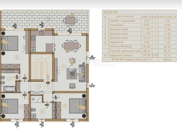 Ovaj penthouse stan dolazi s impresivnim prostorima, uključujući 3 prostrane spavaće sobe, hodnik s garderobom, 2 kupaonice, open space dnevni boravak, kuhinja i blagovaonica, te veliku natkrivenu terasu od 24.26m2