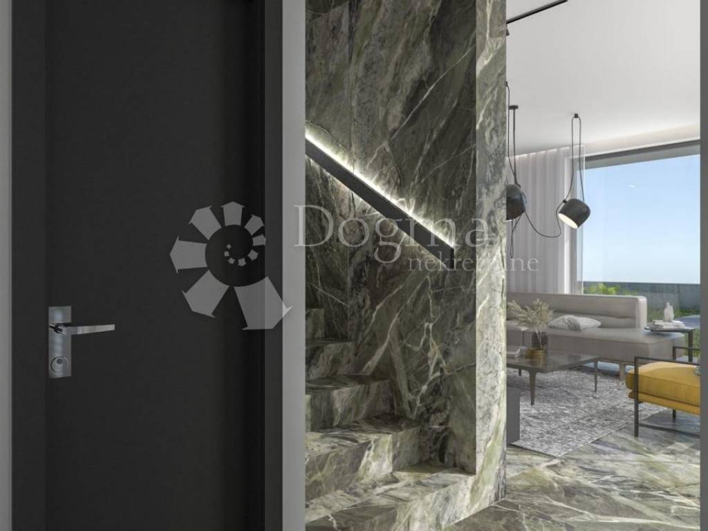 U prizemlju se nalazi spavaća soba sa svojom kupaonicom, dnevni boravak i blagovaonica, kuhinja, wc i terasa od 20 m2.