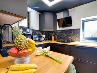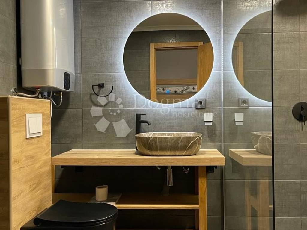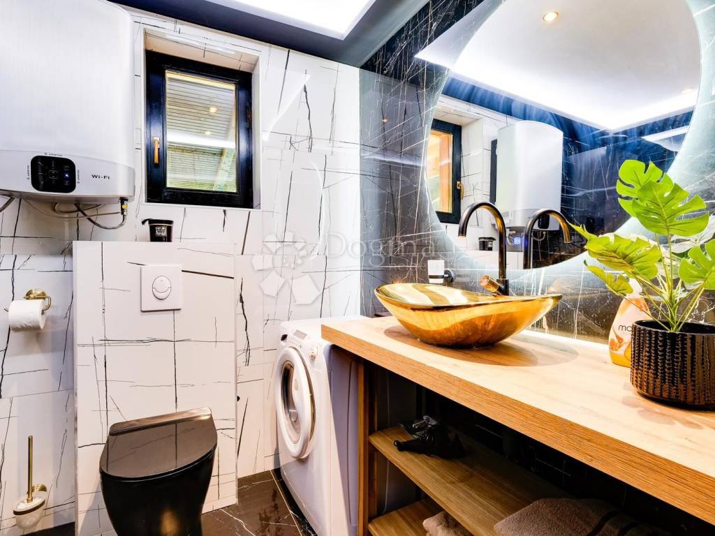 Kuća se sastoji od 2 sobe, kupaone s walk in tuš kabinom i podnim grijanjem , moderna kuhinja s perilicom, indukcijom, pećnicom, napom.