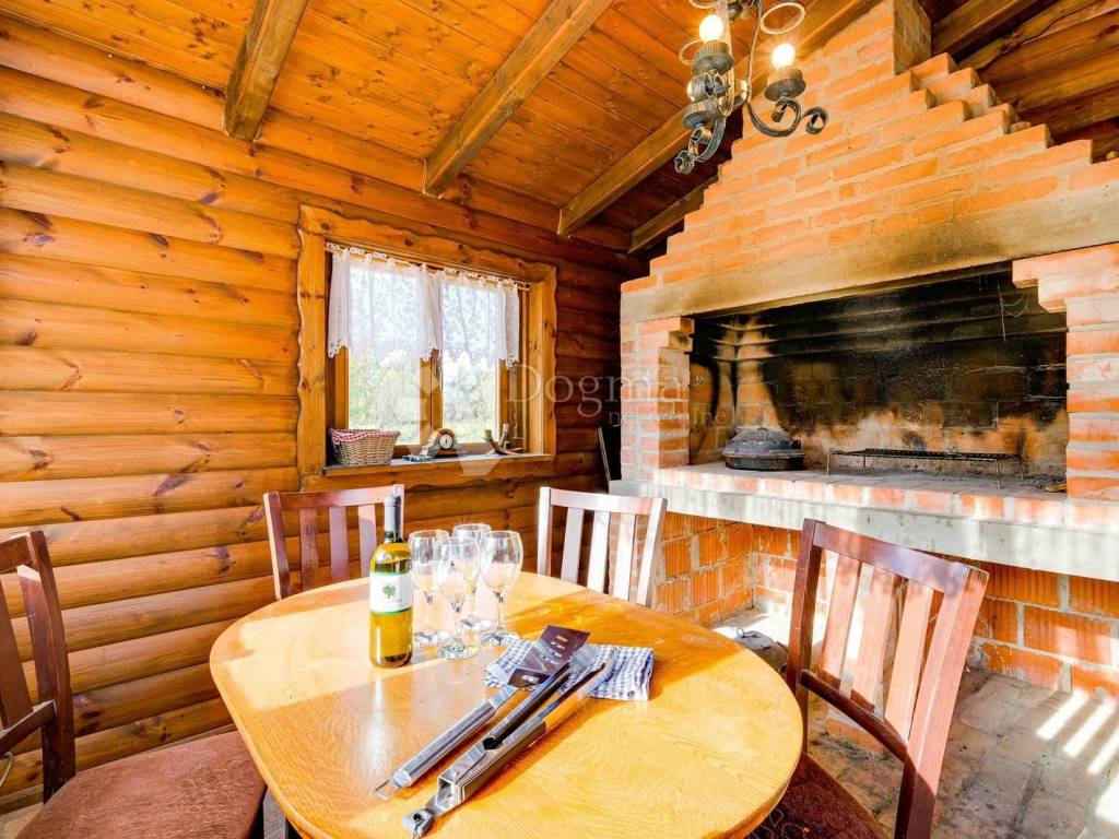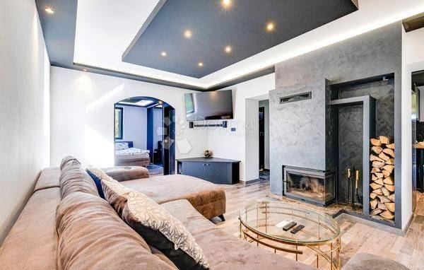 Dnevni boravak opremljen je s kaminom na drva , velikom kutnom garniturom te blagovaonicom.