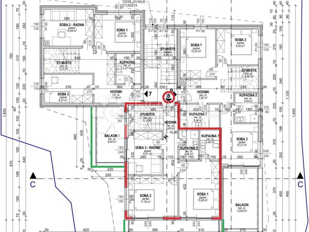 Stan se prostire na dvije etaže (orijentacija: jug-zapad). Prva etaža se sastoji od tri spavaće sobe, dvije kupaonice s wc-om, dva balkona, hodnika i stepeništa koje vodi na drugu etažu. Na drugoj etaži nalaze se dnevni boravak s kuhinjom i blagovaonicom u open space konceptu i kupaonica s wc-om.