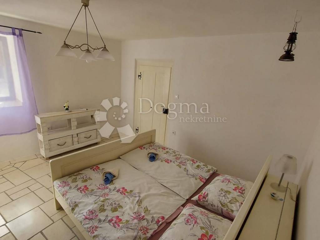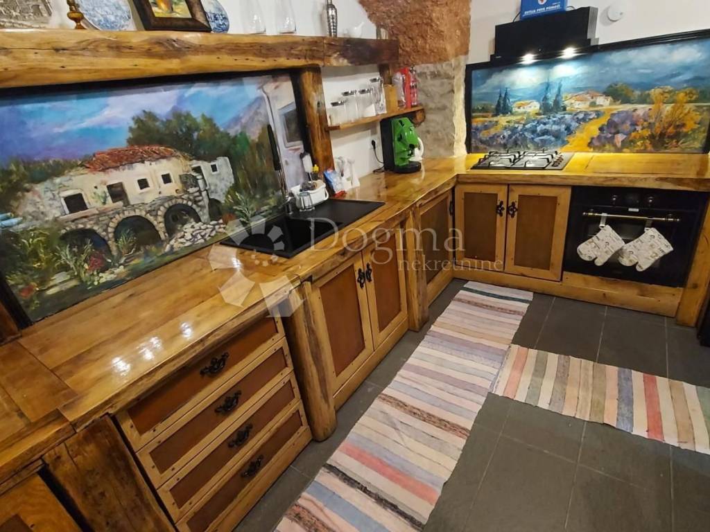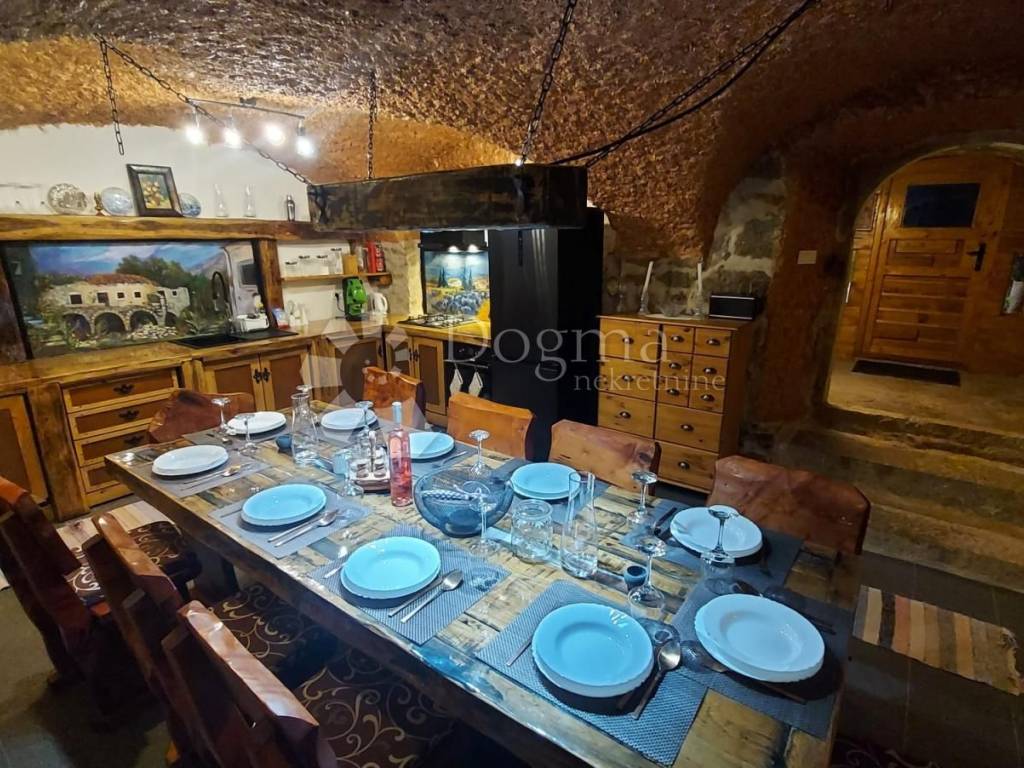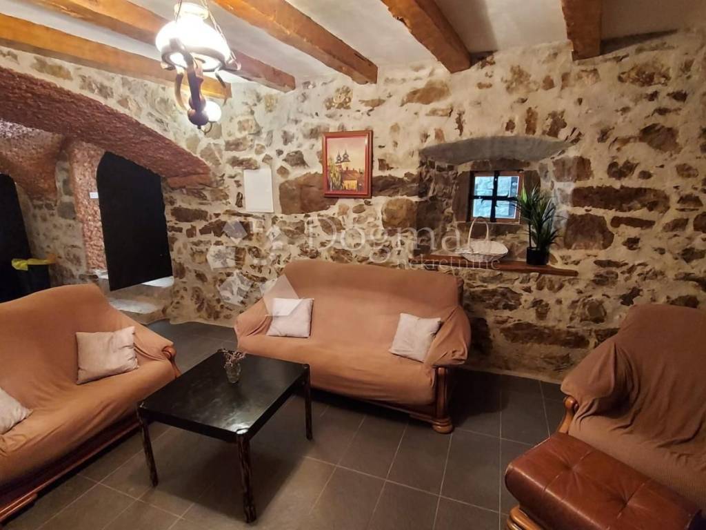 Prolazeći kroz masivna starinska vrata,ulazi se u veliko popločeno dvorište sa bazenom,kaminom te dvije natkrivene terase.