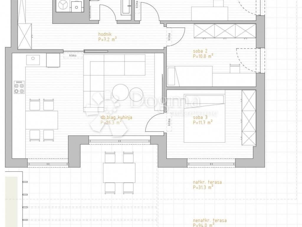 Pripadaju mu natkrivena i nenatkrivena terasa, dva parkirna mjesta u podzemnoj garaži i spremište.