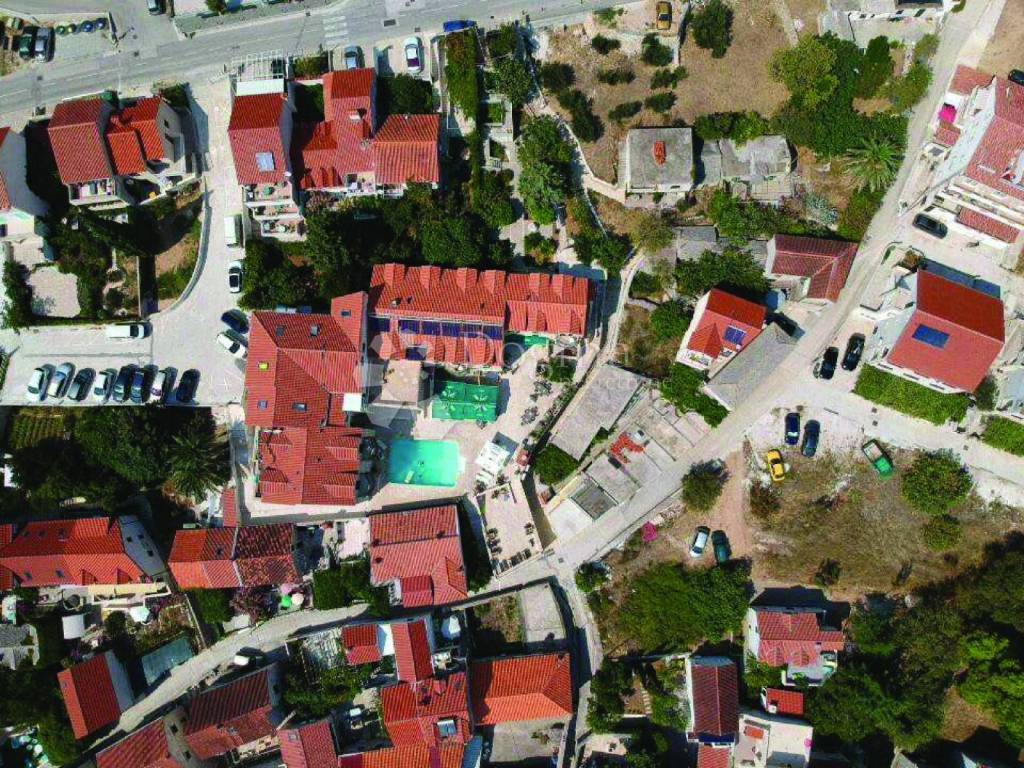 U prizemlju zgrade se nalazi opremljena kuhinja, pomoćne prostorije, restoran koji može primiti 80 ljudi iz kojeg se izlazi na vanjsku terasu (600m2) za natkrivenih 150 sjedećih mjesta, popločenu bračkim kamenom. Ovdje se nalazi i bazen (100m2). Sa istočne strane ulaza se nalazi caffe bar i jedan mali studio apartman. Sa zapadne strane se nalaze pomoćne prostorije i dva velika studio apartmana na (10 kreveta), 2 jednokrevetne sobe i poliklinika za genitalnu medicinu, obiteljsku medicinu, onkologiju i ginekologiju, unutarnji grijani bazen (100 m2), švedska sauna, jakuzi