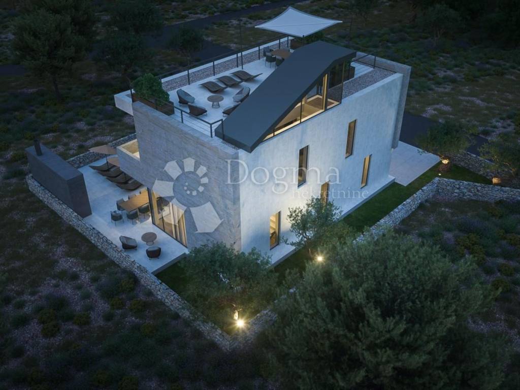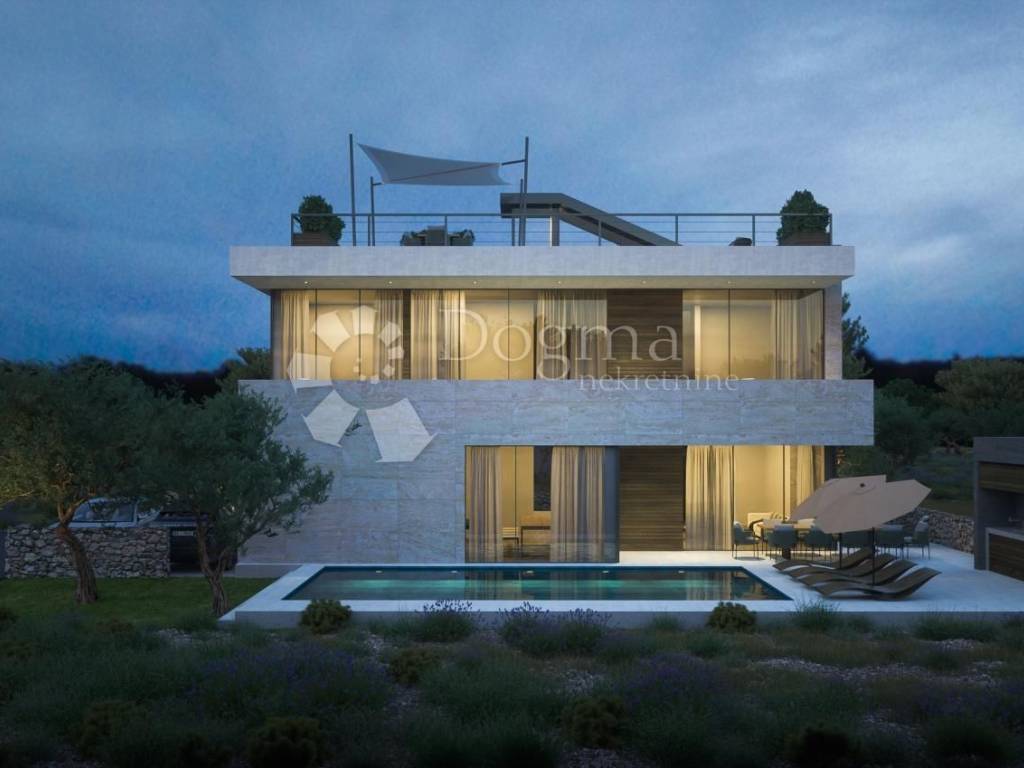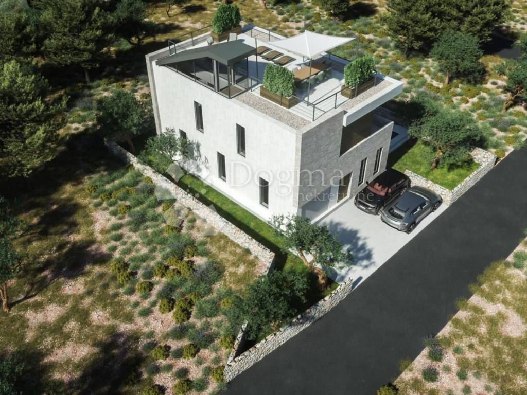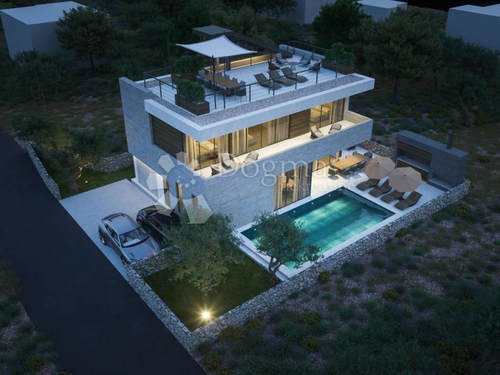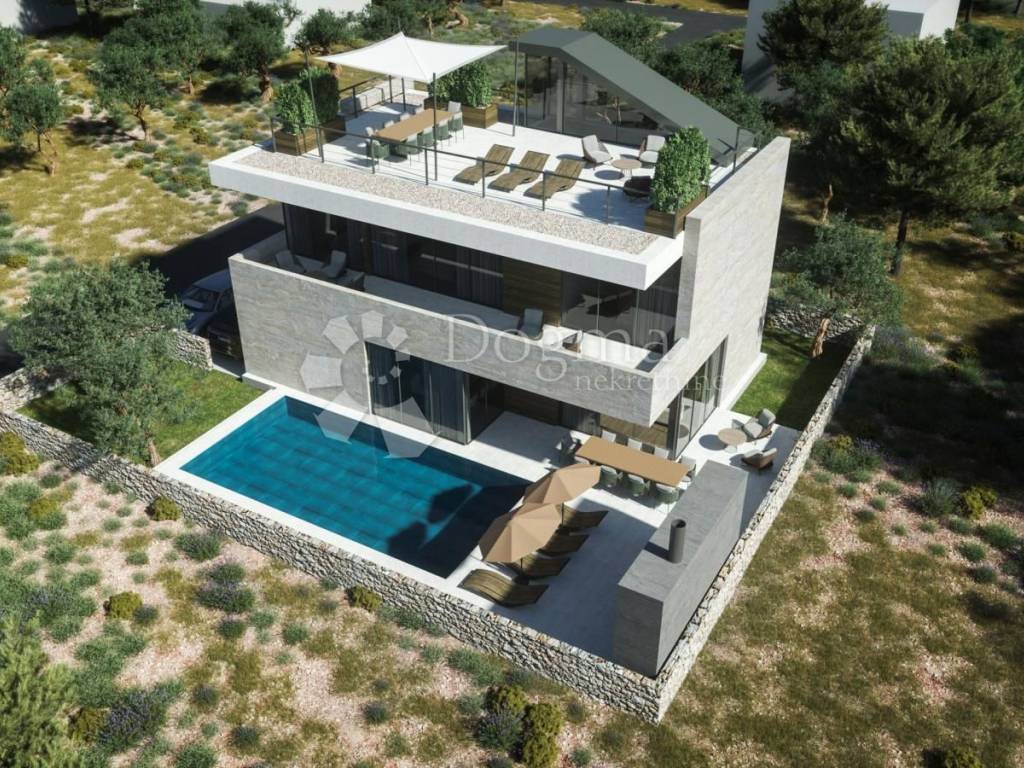 Vila se sastoji od prizemlja sa garažom, ulaznim prostorom, garderobom, toaletom, kuhinjom, blagovaonicom i dnevnim boravkom iz kojeg se nastavlja na dvorište sa natkrivenom terasom i bazenom. Na katu su 3 spavaće sobe, svaka sa en suite kupaonicom i pristupom terasi. Na drugom katu je krovna terasa sa sunčalištem i jacuzzijem, sa koje se pogled otvara na kristalno plavo more i otočiće i te vizure doprinose izuzetnosti pozicioniranosti ove nekretnine.