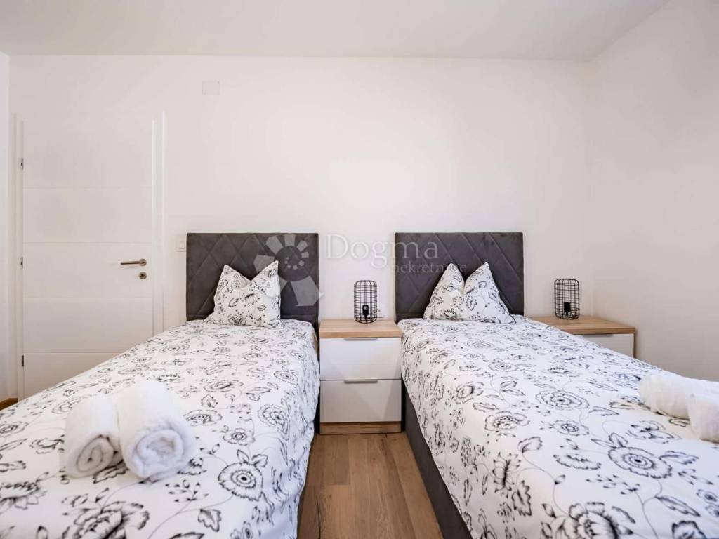 Nekretnina se prodaje kompletno namještena i sastoji od prizemlja i kata. Prizemlje se sastoji od hodnika, garderobe, kuhinje s blagovaonicom, spavaće sobe s vlastitom kupaonicom, toaleta i dnevnog boravka s pristupom na terasu i uređenu okućnicu od cca. 500 m2. Dnevni boravak ima izlaz na prostranu natkrivenu terasu. Unutarnjim stepenicama dolazi se na prvi kat koji se sastoji od tri spavaće sobe s vlastitim kupaonicama, ostave i hodnika. Jedna spavaća soba ima izlaz na balkon.