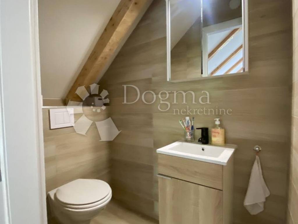 Na katu se nalazi hodnik, kuhinja s rustikalnom blagavaonicom, dnevni boravak, kupaonica i veliki balkon. Ova etaža nudi obilje prostora za druženje, kuhanje i opuštanje. Veliki balkon pruža prekrasan pogled na okolni krajolik i zelenilo.