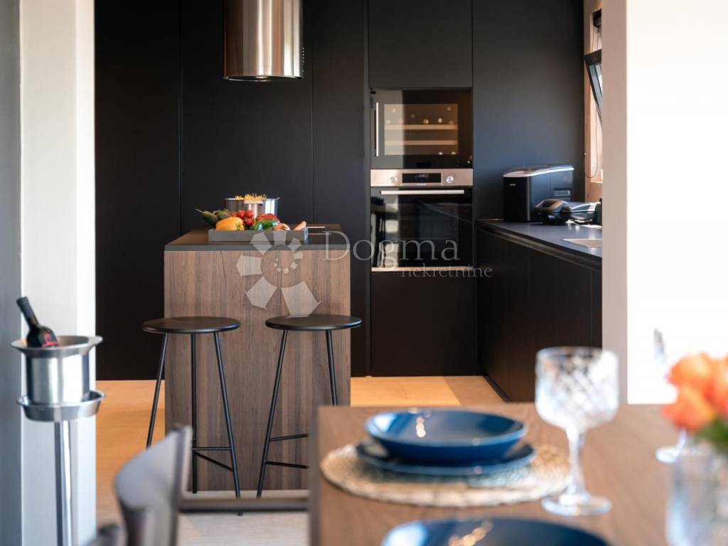 Ulaskom u stan, elegantnim stepenicama se penje do prostranog dnevnog boravka koji se nadovezuje na kuhinju. Svijetla i prozračna, kuhinja je opremljena visokokvalitetnim kućanskim aparatima poznatih marki.