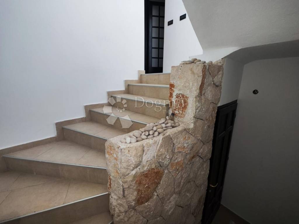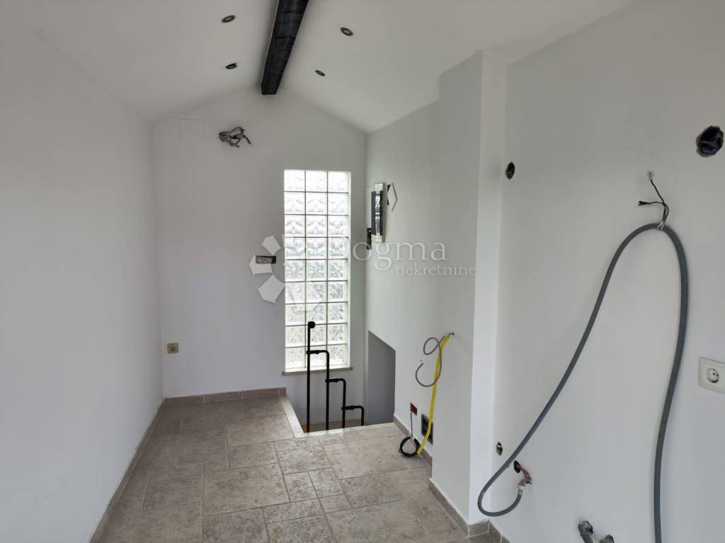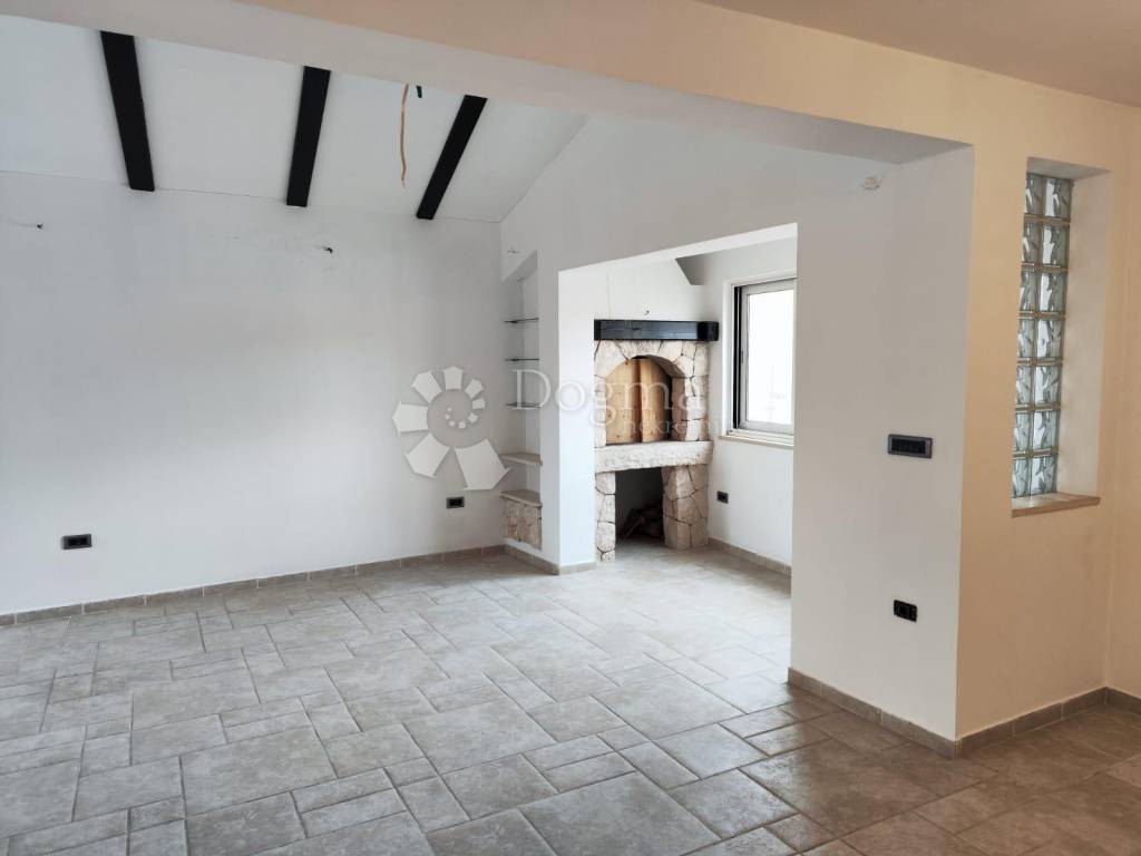 Gornja etaža je zamišljena kao prostrani dnevni dio s kuhinjom i blagovaonicom, a ima i ugrađen kamin.