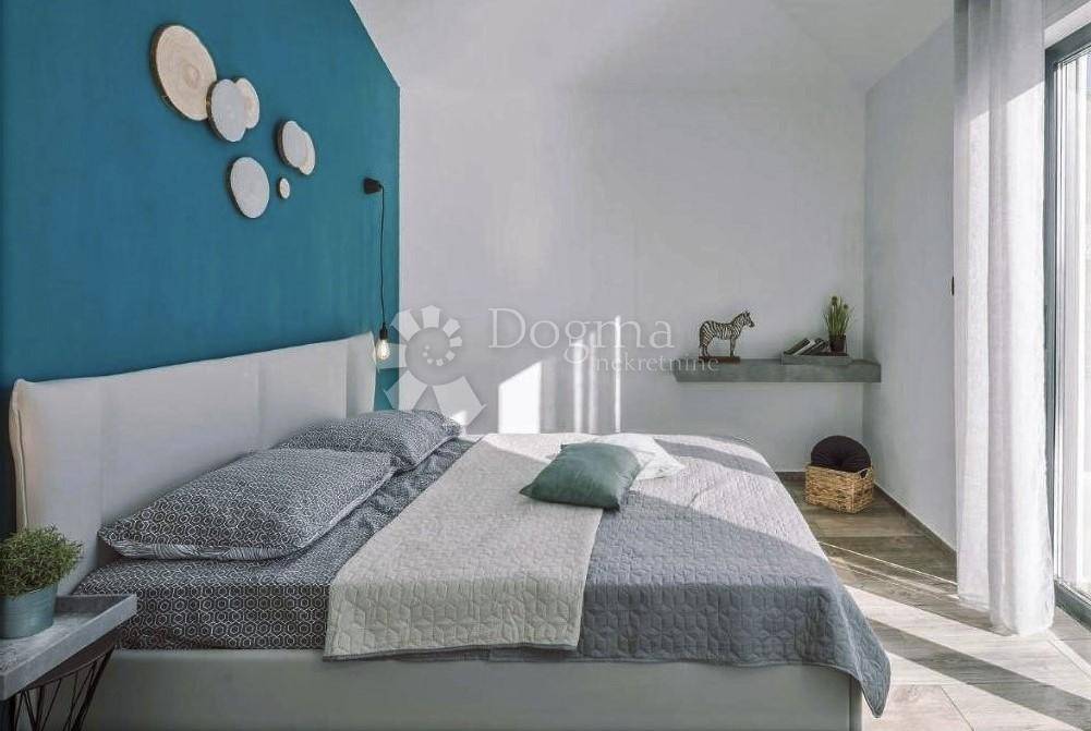 U prizemlju se nalazi predivan dnevni boravak sa kaminom, kuhinja rađena po mjeri i blagovaona. S obzirom da se radi o otvorenom konceptu prostorija imamo pogled na predivan vrt i bazen, te pristup natkrivenoj terasi na kojoj možemo uživati tijekom cijele godine. U prizemlju se nalazi i spavaća soba i kupaona. Na katu se nalaze još tri spavaće sobe sa kupaonicama i jedna prostorija koja je uređena za teretanu. Također, na katu možete uživati na terasi sa koje se pruža pogled na more. Sve prostorije u kući su prostrane i sam raspored prostorija je vrlo praktičan. Osim dizajna i stila koji posjeduje, ova vila dodatnu vrijednost ima i u kvaliteti materijala koju su korišteni prilikom gradnje te samim namještajem koji je biran da biste mogli uživati u potpunosti.