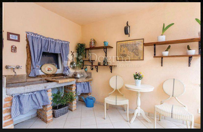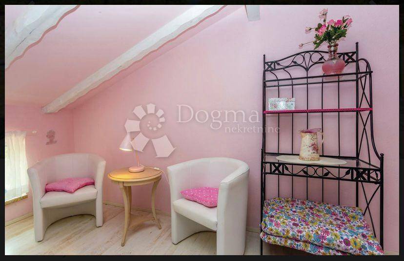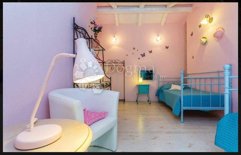 U prizemlju se nalazi konoba s originalnom kamenom prešom (toš) koja je služila za proizvodnju maslinovog ulja, te jedan apartman.