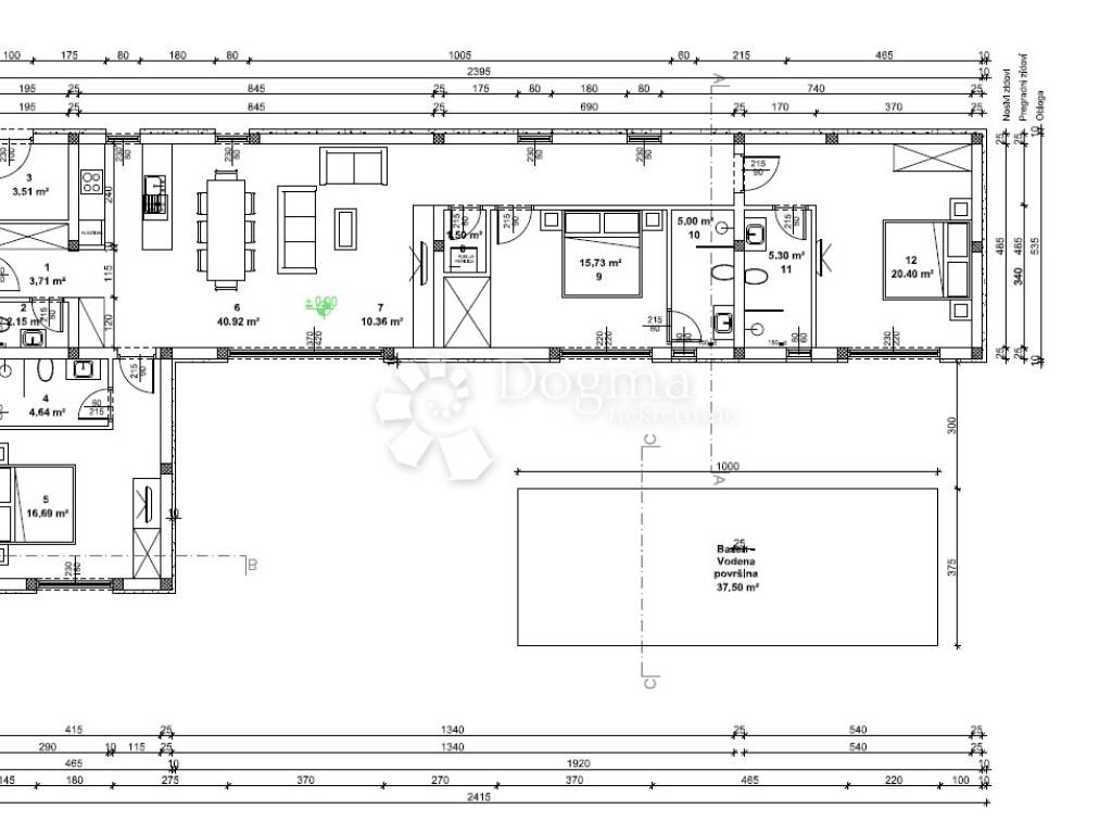 Zamišljena kao prizemnica sa tri spavaće sobe sa vlastitim kupaonicama, gostinjskog toaleta te kuhinje sa blagovaonom i dnevnim boravkom otvorenog tipa sa puno sunčevog svijetla te izlazom na vanjsku blagovaonu te plažu bazena površine 38m2.