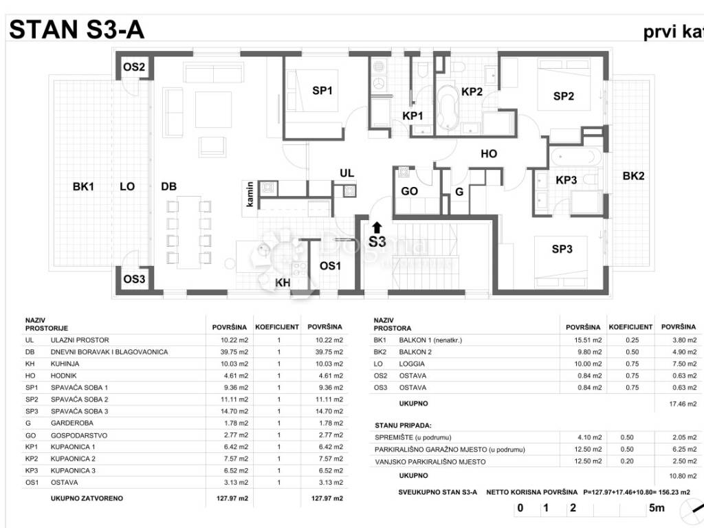 Ukupna površina zatvorenog dijela stana iznosi 127,97 m2 (NKP), a terase i balkona 17,46 m2 (NKP). Uz stan dolazi i spremište u podrumu, vanjsko parkirno mjesto i parkirno mjesto u garaži.