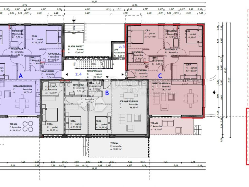 Ukupna površina stana C koji se nalazi u prizemlju je 113,32 m2 i sastoji se od ulaznog dijela, izbe, tri spavaće sobe, dvije kupaone prostrane kuhinje sa dnevnim boravkom iz kojeg se izlazi na terasu i prostrani vrt sa zasebnim ulazom u stan.