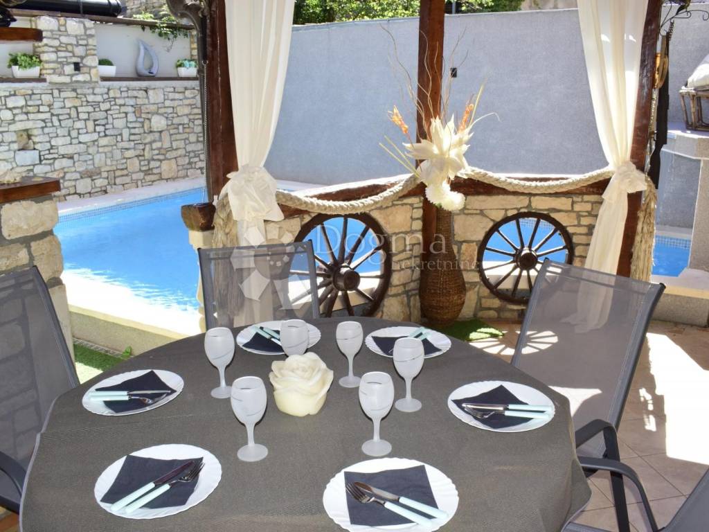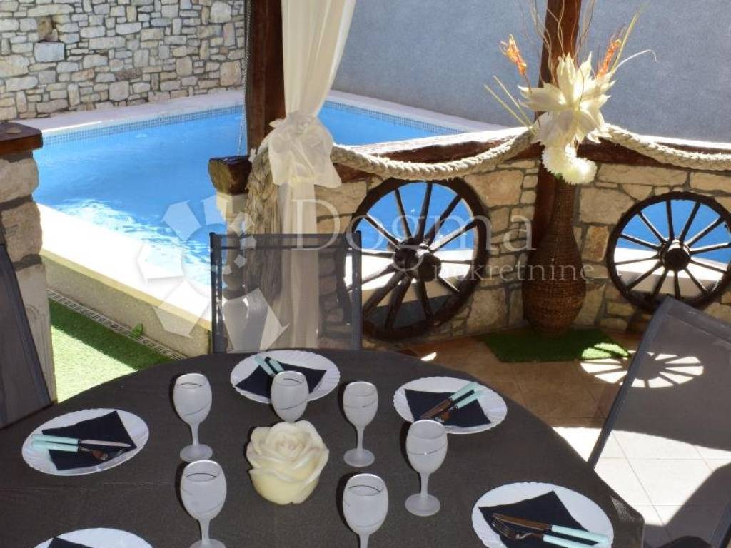 Upravo u Šišanu je smještena ova predivna novoadaptirana kamena kuća sa bazenom površine 100 m2. Kuća se prostire na dvije etaže od koje je svaka površine 50 m2, na prizemnoj etaži se nalazi ulazni pred prostor, prostrani dnevni boravak sa unutarnjim kaminom i akvarijem, prostrano kupatilo, kuhinja sa prostorom za ručanje kroz koju se izlazi na predivnu natkrivenu terasu i okućnicu, gdje se nalazi bazen sa vodopadom, vanjski tuš, vanjska kuhinja, roštilj i sunčalište sa ostavom, dok se na gornjoj etaži povezanoj sa unutarnjim kamenim stepeništem nalazi kupatilo i tri spavaće sobe. Na objektu kao što je vidljivo se pomno pazilo na svaki detalj, te je rađena u moderno rustikalnom stilu. Na kući je zadnja adaptacija rađena 2020 godine, a na novo je izgrađena 2009 godine kada su rađene sve međukatne konstrukcije, instalacije struje, vode, sustav ventilacije toplog zraka kroz objekt te unutarnji kamin koji zagrijava taj isti zrak, instalacije klima uređaja od kojih svaka etaža posjeduje po jednu jedinicu, postavljena visokokvalitetna PVC stolarija boje drva, te zavidna krovna toplinsko zvučna izolacija. Kuća je izolirana termo fasadom debljine 5 cm, spojena je na septičku jamu sa spremnim instalacijama za kanalizaciju, posjeduje mogućnost i nadogradnje jedne etaže što bi nam pružalo predivan pogled na more.
