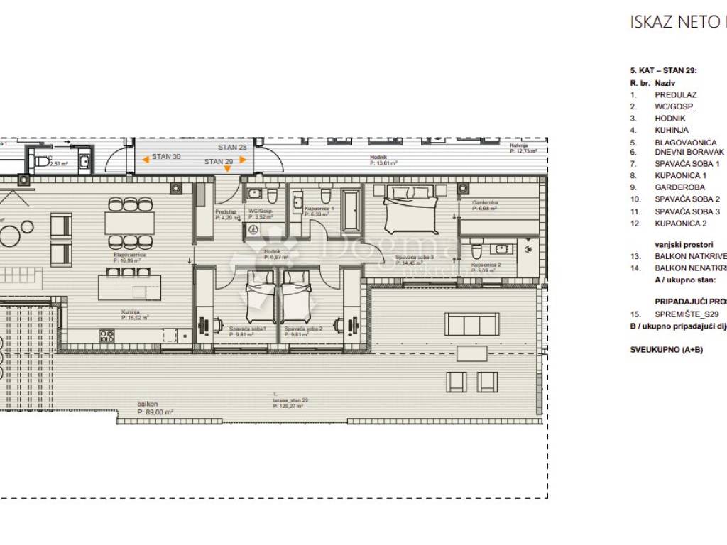 Stan 29 se nalazi na petom, od ukupno pet katova, ukupne neto kvadrature sa pripadcima 177,43 m2, a sastoji se od