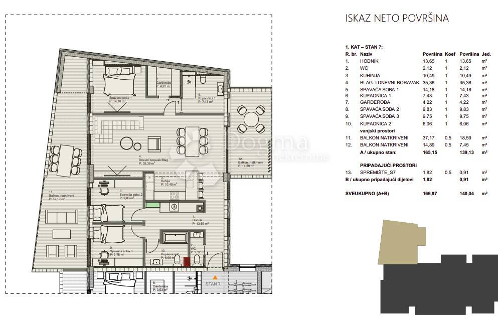 Stan 7 se nalazi na prvom katu, ukupne neto kvadrature sa pripadcima 153,04 m2, a sastoji se od