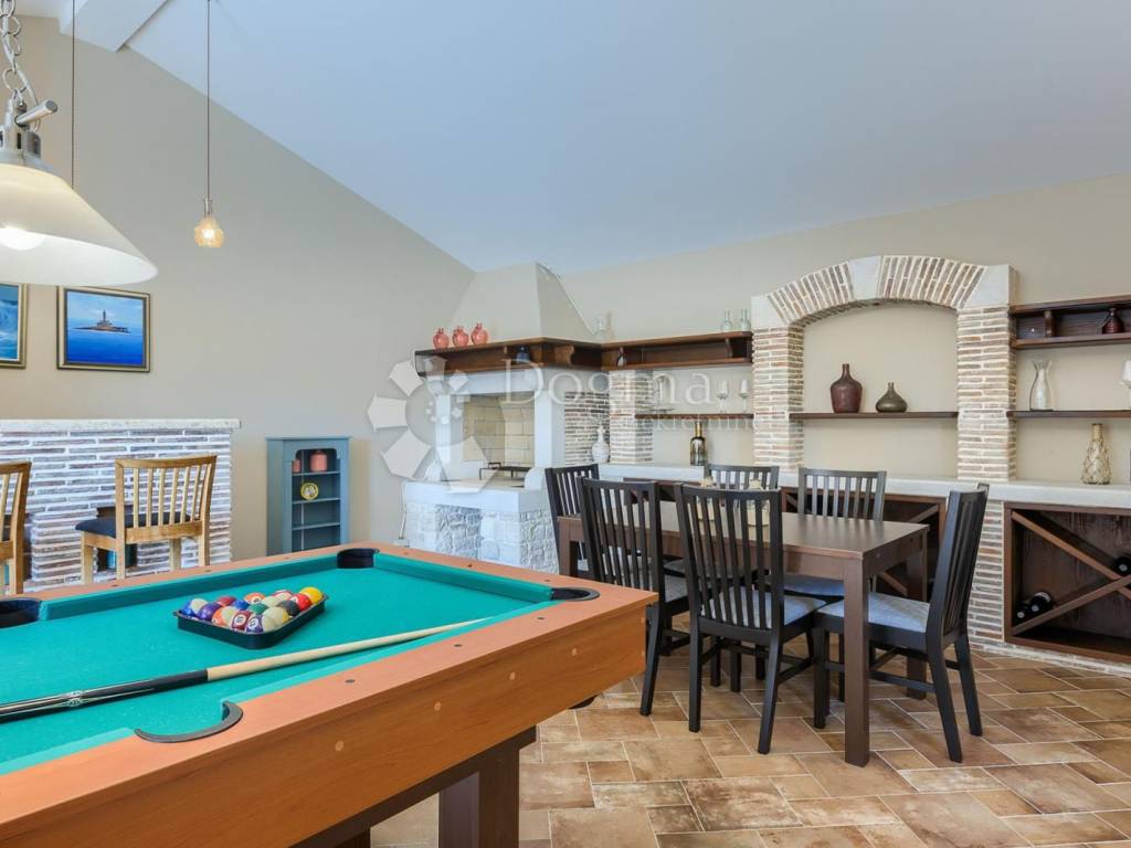 U prizemlju nudi open space dnevni boravak sa kaminom blagovaonom i kuhinjom, dvije spavaće sobe sa kupaonom, prostorija sa biljarom, barom i blagovaonskim stolom.