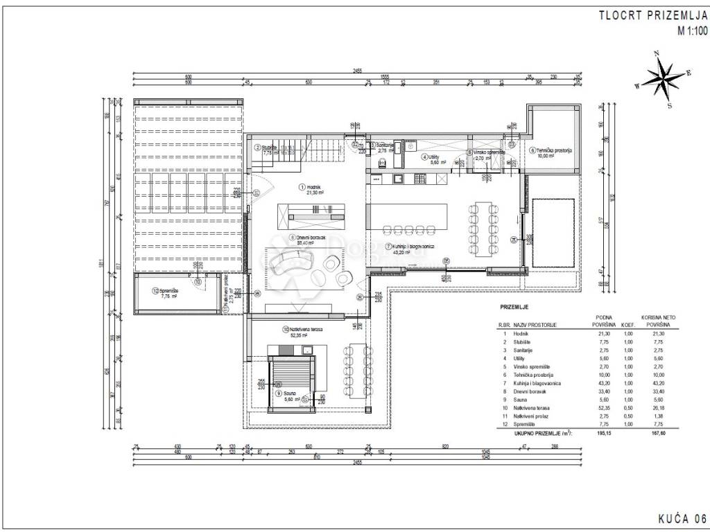 Odlično iskorišteno prizemlje sastoji se od kuhinje sa blagovanicom i vinskim spremištem, dnevnim boravkom koji u nastavku nidi natkrivenu terasu sa saunom i vanjskom garniturom.