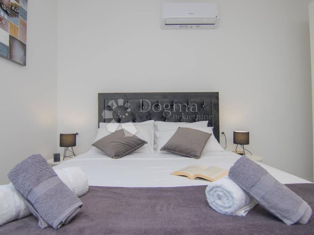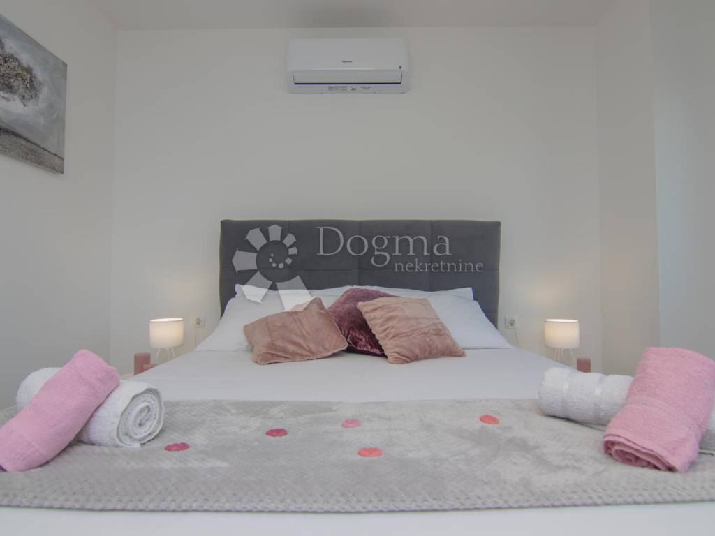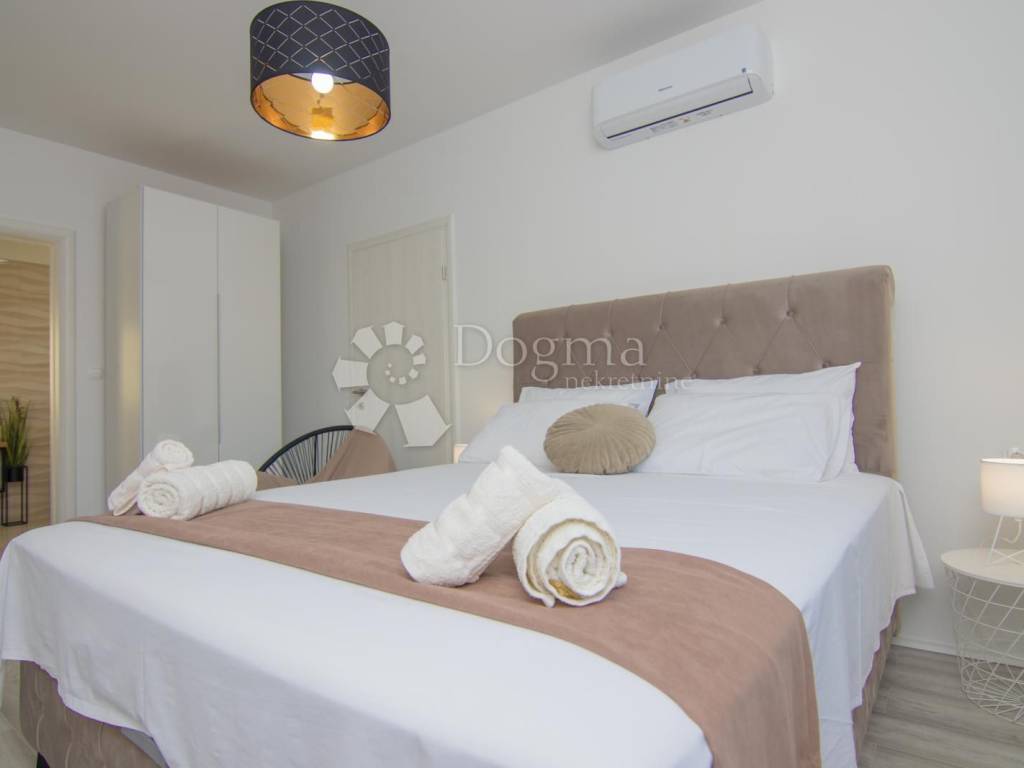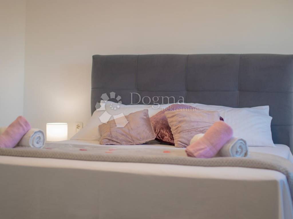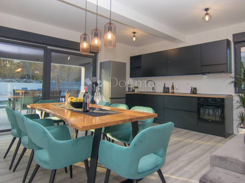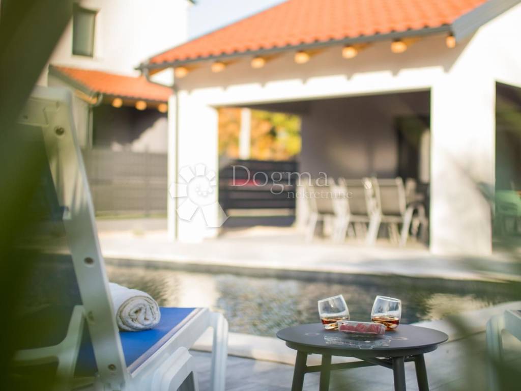 Na katu su smještene tri spavaće sobe, svaka sa svojom kupaonicom, dok je prizemlju dnevni boravak, blagovaonica, kuhinja, još jedna spavaća soba te spremište. Iz dnevnog dijela se izlazi u dvorišni dio gdje je smješten bazen te roštilj i sunčalište. Moderno opremljeno i potpuno namješteno!