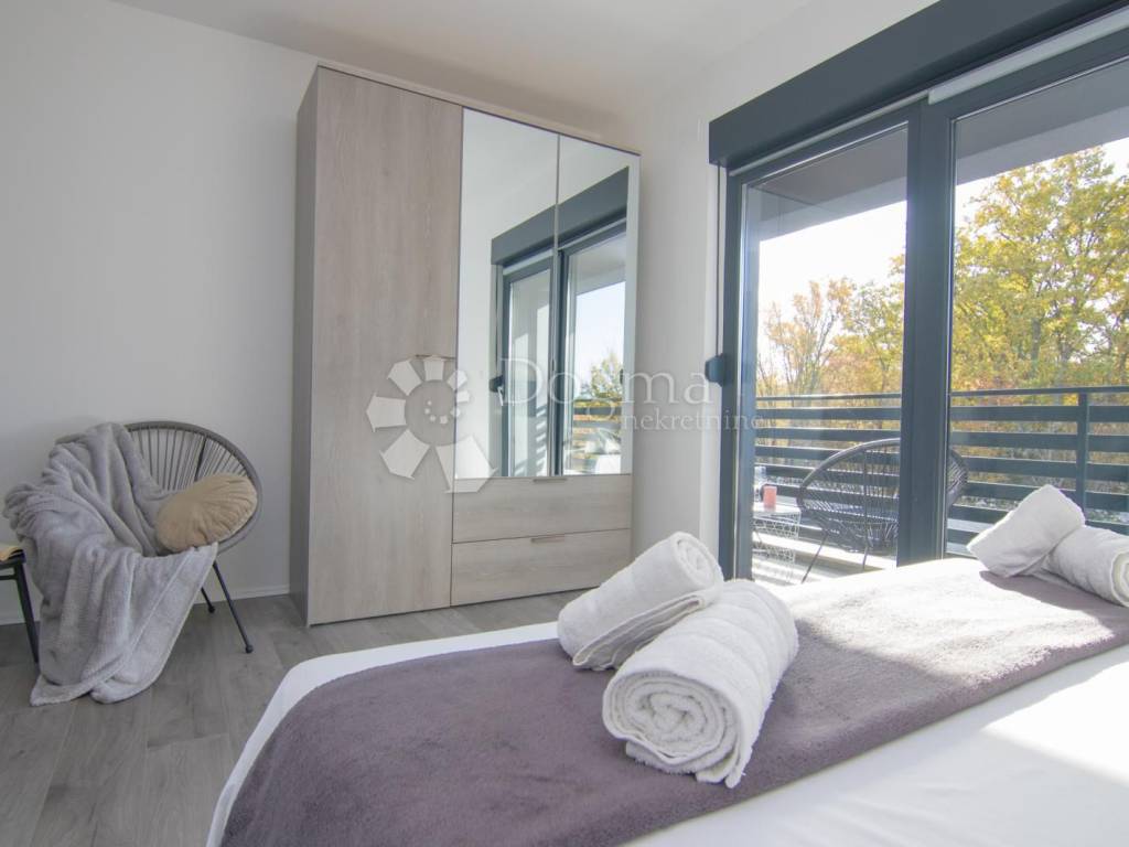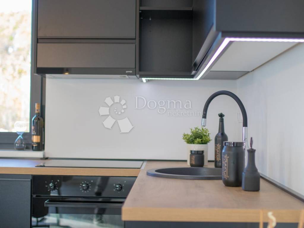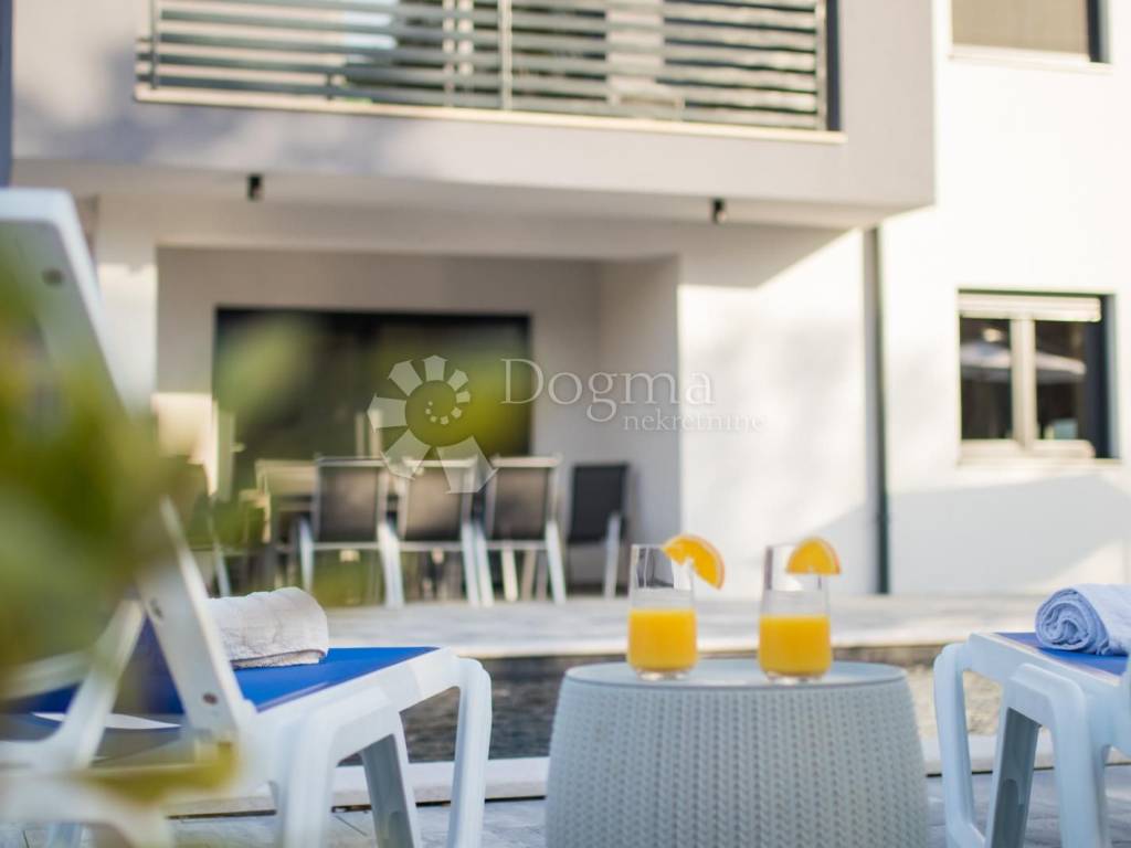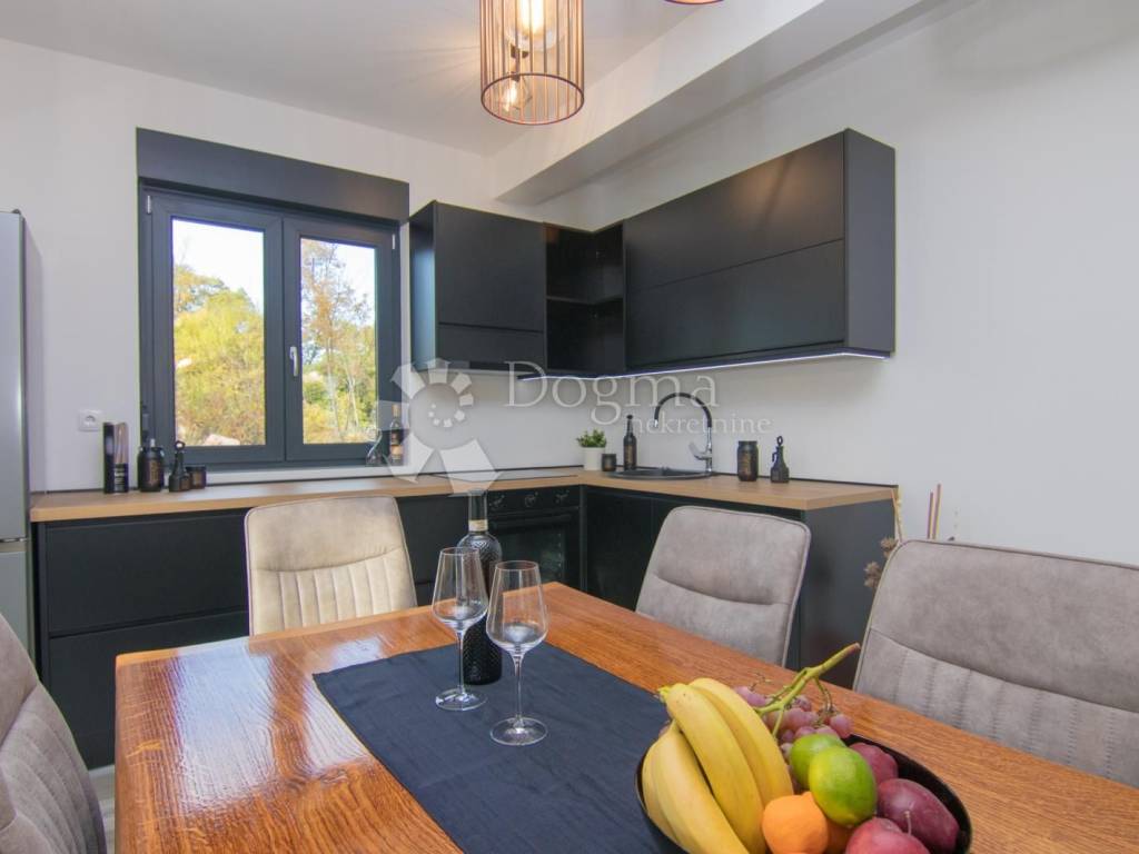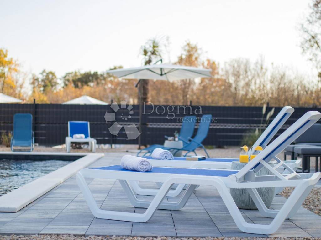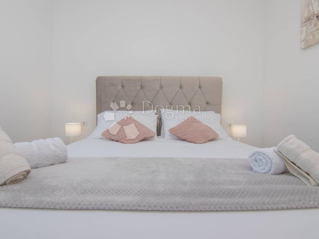 Na katu su smještene tri spavaće sobe, svaka sa svojom kupaonicom, dok je prizemlju dnevni boravak, blagovaonica, kuhinja, još jedna spavaća soba te spremište. Iz dnevnog dijela se izlazi u dvorišni dio gdje je smješten bazen te roštilj i sunčalište. Moderno opremljeno i potpuno namješteno!