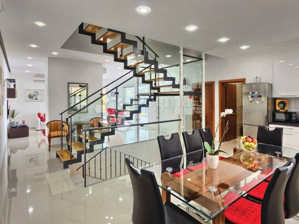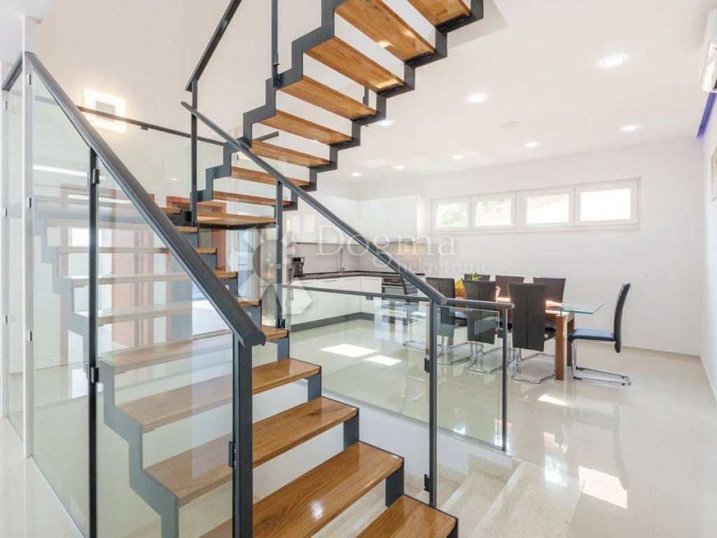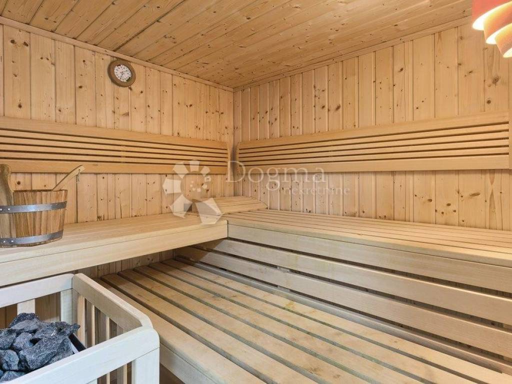 Kuća se prostire na čak 300 m a sastoji se od dnevnog dijela sa kuhinjom i blagovaonicom, četiri prostrane spavaće sobe sa vlastitim kupaonicama i saune.