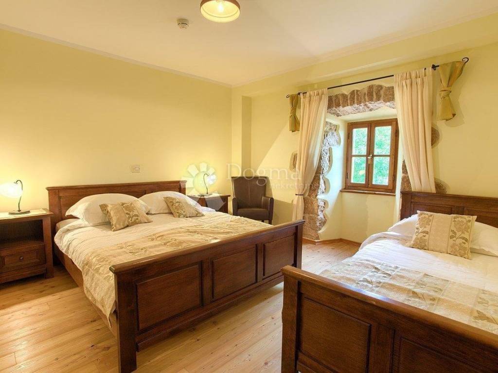 U prizemlju se nalaze prostrana kuhinja, veliki dnevni boravak uz zasebno mjesto za gledanje televizije, toalet sa tuš kabinom i izdvojenim WC-om te prostorija za zabavu s igrama (stolni nogomet, pikado i sprave za vježbanje) izlaz na prekrasnu kultiviranu okućnicu iz dnevnog dijela . Na katu su dvije dvokrevetne sobe i jedna trokrevetna, veliki toalet sa WC-om i kadom za tuširanje. Kuća ima podno grijanje te klimu u svim prostorijama. Svaka soba ima televizor sa satelitskim prijemnikom.