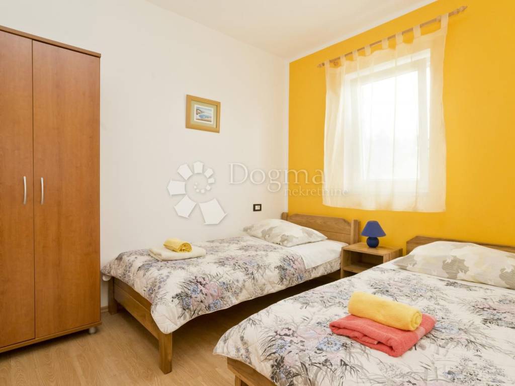 Na idealnoj lokaciji, samo u ponudi naše agencije prodaje se kuća sa tri apartmana. U prizemlju kuće nalaze se dva apartmana. Prvi je apartman površine 39,45 m, te se sastoji od kuhinje s dnevnim boravkom, dvije spavaće sobe, od kojih jedna ima pogled na prekrasno Jadransko plavetnilo, te kupatila. Na katu se nalazi još jedan apartman površine 76 m. Tu možemo naći kuhinju s prostranom blagovaonom, dnevni boravak koji ima izlaz na terasu na kojoj možemo uživati uz prekrasan pogled, dvije spavaće sobe, te kupatila. Stubištem dolazimo u potkrovlje kuće, gdje se smjestio još jedan prostran stan od 76 m. Stan se sastoji od kuhinje s blagovaonom, dvije spavaće sobe, te dva kupatila.