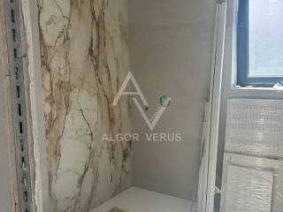 Stan je gradjen kvalitetnim materijalima, pločicama i mramorom.