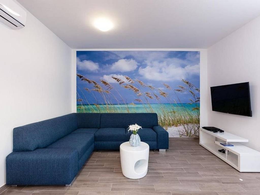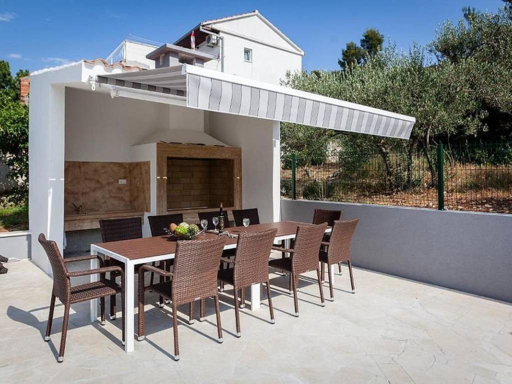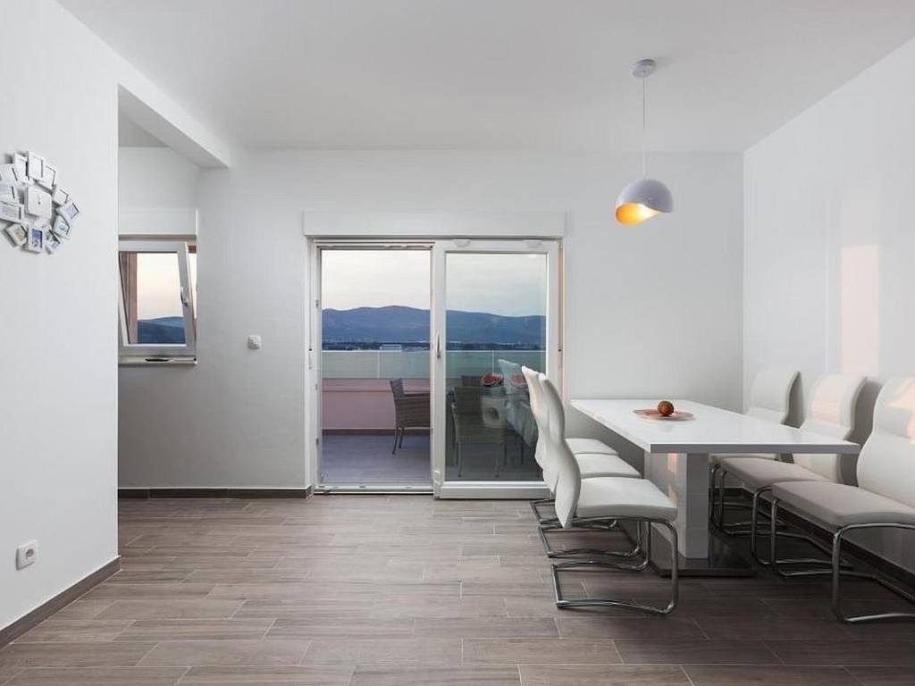 Na prodaju je moderna apartmanska kuća na izvrsnoj lokaciji u prvom redu do mora, idealna kako za privatno uživanje tako i za turistički najam. Objekt se nalazi na atraktivnoj sjevernoj strani otoka Čiovo, poznatoj po odličnom spoju mirnog mediteranskog ambijenta i blizine grada Trogira, a sastoji se od sveukupno četiri prostrana i funkcionalno raspoređena apartmana. U prizemlju kuće smješten je jednosoban apartman koji se sastoji od dnevnog boravka s kuhinjom i blagovaonicom, spavaće sobe i kupaonice, a zbog svog rasporeda i pozicije idealan je za stanovanje osobe koja održava objekt tijekom najma ili kao zasebna jedinica za goste. Na prvom, drugom i trećem katu nalaze se trosobni apartmani s velikim terasama koje se protežu duž cijelog stana te nude prekrasan, otvoren pogled na more i zalazak sunca. Svaki stan ima prostrani hodnik, tri udobne spavaće sobe, od kojih dvije imaju vlastite kupaonice, dodatnu kupaonicu te moderno uređen dnevni dio koji uključuje kuhinju opremljenu svim potrebnim aparatima, blagovaonicu i svijetli dnevni boravak s izlazom na prostranu terasu. Cijeli objekt je klimatiziran – svaki trosobni stan ima po četiri klima uređaja, dok stan u prizemlju ima jedan. Kuća se prodaje u potpunosti namještena i opremljena, što omogućuje nastavak korištenja ili najma bez dodatnih ulaganja. Poseban adut je bazen smješten iza kuće, orijentiran na jug, koji pruža cjelodnevno sunce. Uz bazen se nalazi sunčalište za opuštanje, kamin s prostorom za druženje i blagovanje na otvorenom, što ovu nekretninu čini još atraktivnijom. Od dodatnih sadržaja, koji su iznimno važni za turistički najam, izdvajaju se moderno uređeno igralište za djecu te opremljena teretana. Ispred objekta osigurano je dovoljno vanjskih parkirnih mjesta za stanare i goste, a u neposrednoj blizini nalazi se i besplatni javni parking, što dodatno povećava praktičnost. Lokacija objekta je vrhunska – u neposrednoj blizini nalaze se supermarket, uređena plaža s dodatnim sadržajima, restoran, kafići te svi drugi sadržaji potrebni za kvalitetan i ugodan boravak. Blizina Trogira i međunarodne zračne luke Split dodatno naglašava investicijsku vrijednost ove nekretnine.
