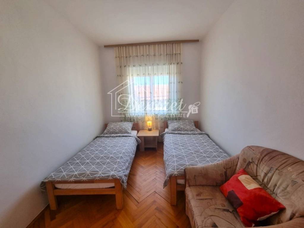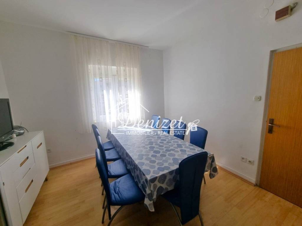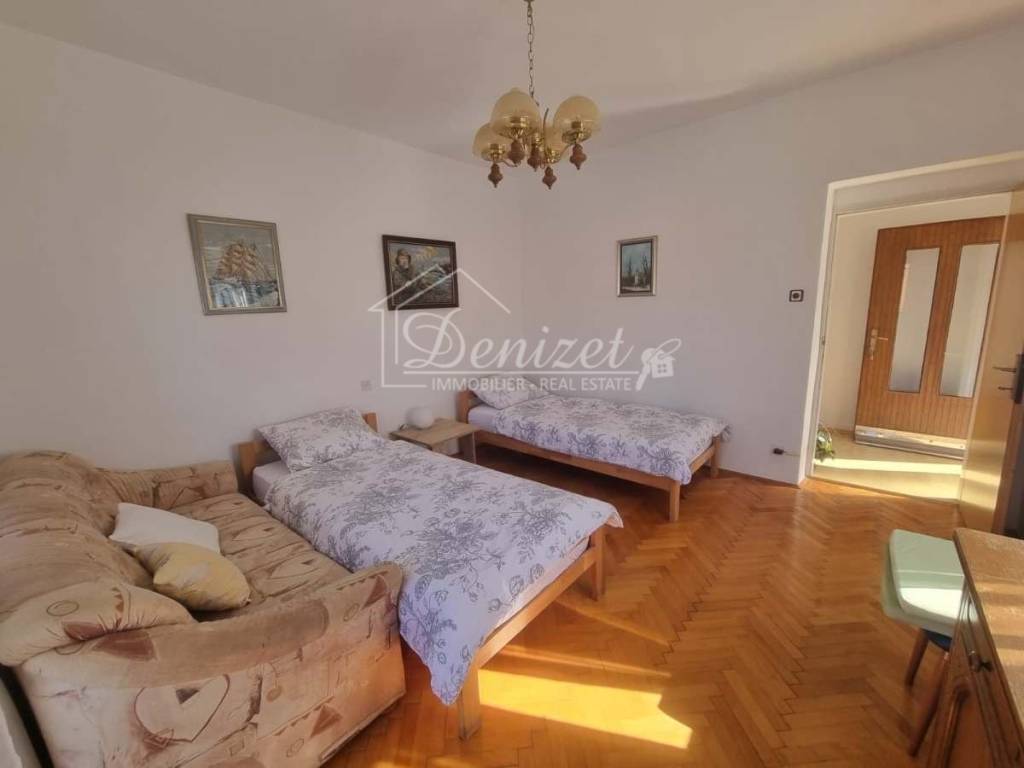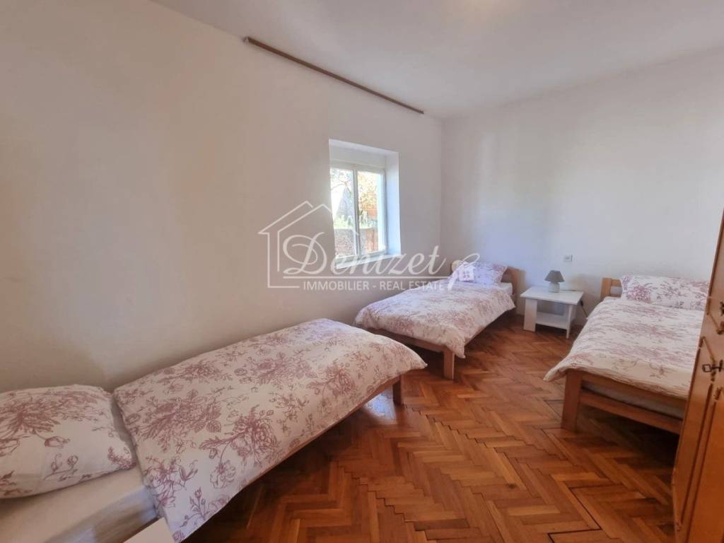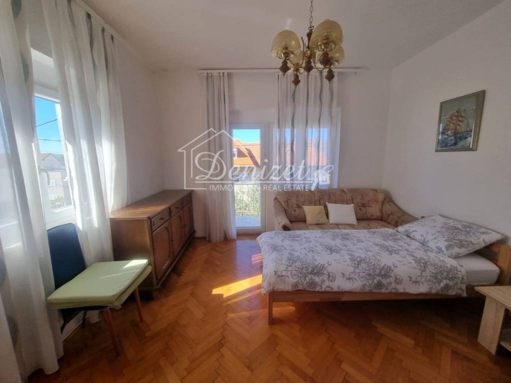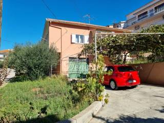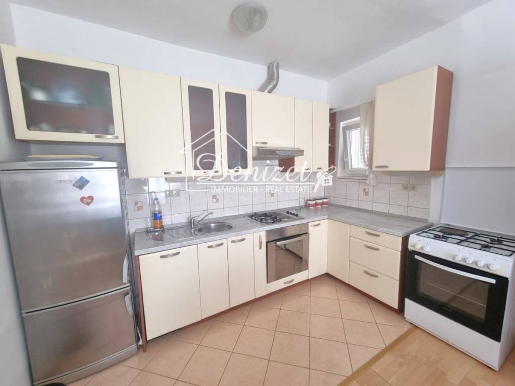 U prizemlju se nalazi prostor koji trenutačno služi kao garaža i prostrano spremište, a koji se može prenamijeniti u dodatnu stambenu jedinicu. Na kat se pristupa vanjskim stubištem, a sastoji se od hodnika, kuhinje i blagovaonice, odvojenog dnevnog boravka, tri spavaće sobe i kupaonice. Iz dnevnog boravka i jedne spavaće sobe se pruža izlaz na prostrani balkon. Ovaj stan je uređen, namješten i spreman za useljenje.