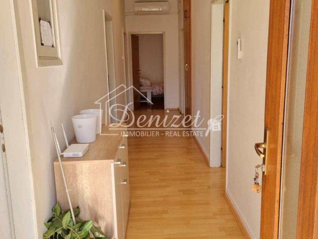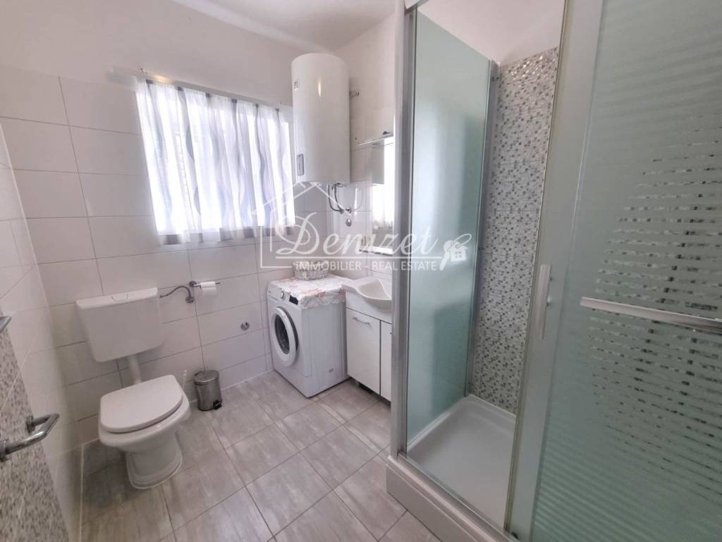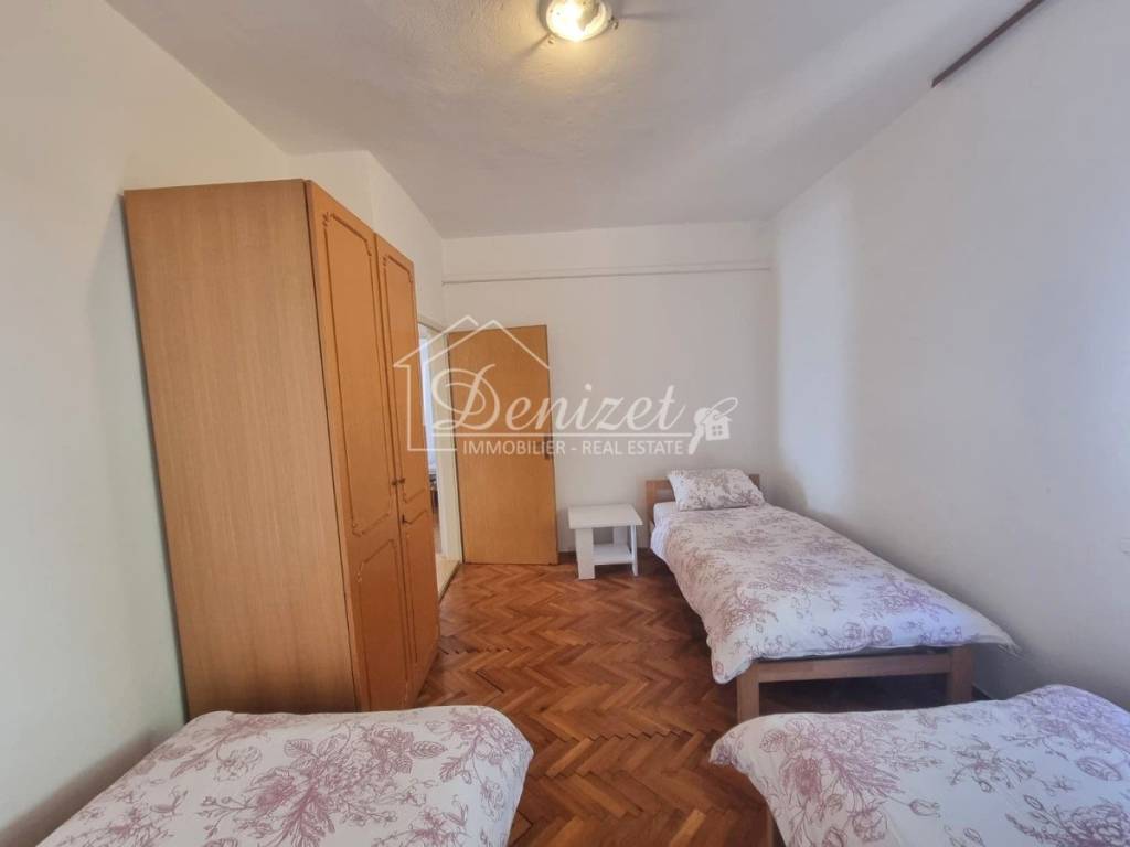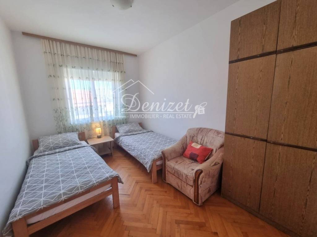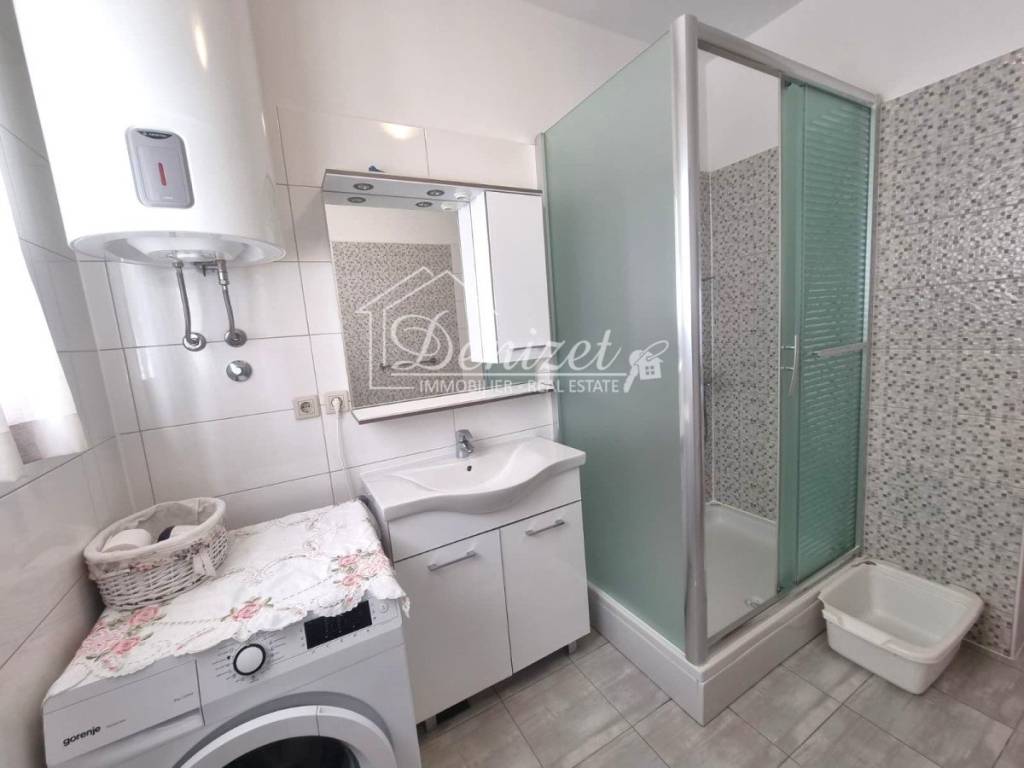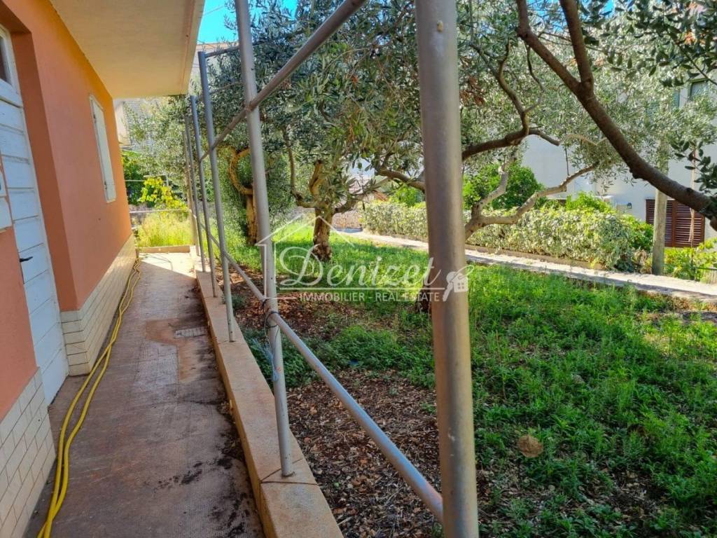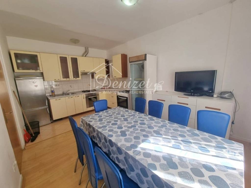 U prizemlju se nalazi prostor koji trenutačno služi kao garaža i prostrano spremište, a koji se može prenamijeniti u dodatnu stambenu jedinicu. Na kat se pristupa vanjskim stubištem, a sastoji se od hodnika, kuhinje i blagovaonice, odvojenog dnevnog boravka, tri spavaće sobe i kupaonice. Iz dnevnog boravka i jedne spavaće sobe se pruža izlaz na prostrani balkon. Ovaj stan je uređen, namješten i spreman za useljenje.