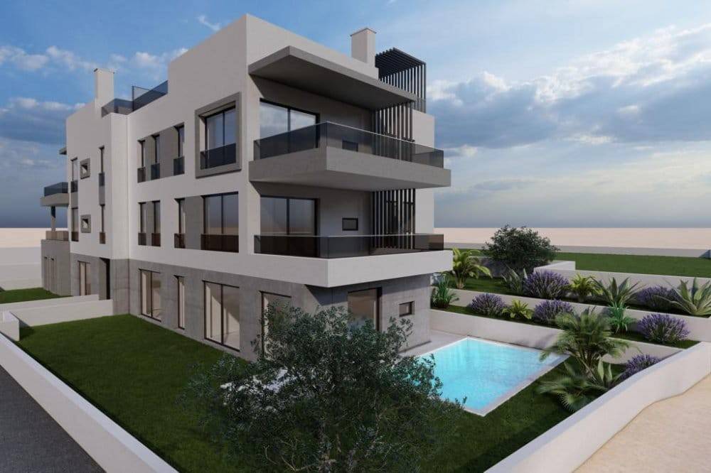 Na prodaju su dva dvosobna stana u stambenoj zgradi u izgradnji u naselju Okrug Gornji, na južnoj strani otoka Čiova. Zgrada se prostire na četiri etaže (podrum, suteren, prizemlje i prvi kat), a sadrži šest stambenih jedinica. Jedan stan koji je na prodaju nalazi se u suterenu zgrade, a drugi se nalazi u prizemlju. Radi se o visokom prizemlju koje ima dojam višeg kata. Stanovi se sastoje od prostranog dnevnog boravka, kuhinje, blagovaonice, dvije spavaće sobe i dvije kupaonice. Stan u suterenu ima izlaz u veliki vrt s bazenom. Stan u visokom prizemlju ima izlaz na veliku natkrivenu terasu na kojoj će se nalaziti jacuzzi. Svaki stan će imati vlastito garažno parking mjesto koje se nalazi u podrumu zgrade. Postoji i mogućnost kupnje spremišta u podrumu zgrade uz dodatnu nadoplatu. Zgrada je kvalitetno građena i opremljena: zgrada ima lift, a stanovi će imati podno grijanje, klima uređaje, električne rolete, kvalitetnu keramiku i PVC stolariju…Završetak izgradnje objekta planiran je do ljeta 2025. godine. Zgrada je orijentirana prema jugu, stoga su stanovi osunčani, topli i prozračni. Objekt je u mirnom dijelu područja naselja od mora udaljen svega 150 m, od grada Trogira 4 km, a od zračne luke Split 9 km.SUTERENS1 – stambena površina od 89 m2 + prostrani vrt + bazen od 12 m2. Cijena: 440 000 €PRIZEMLJES3 – stambena površina od 71 m2 + terasa od 33 m2+ jacuzzi. Cijena: 360 000 €