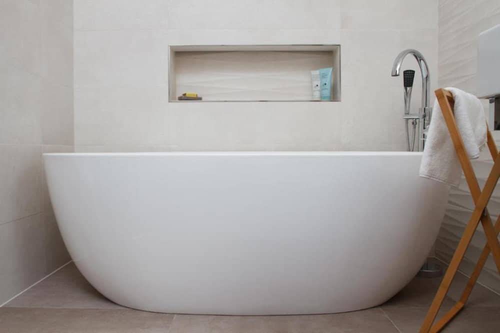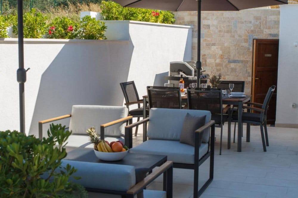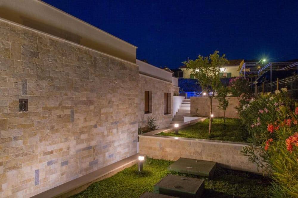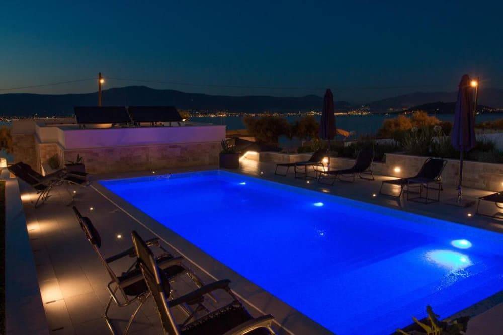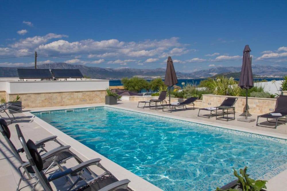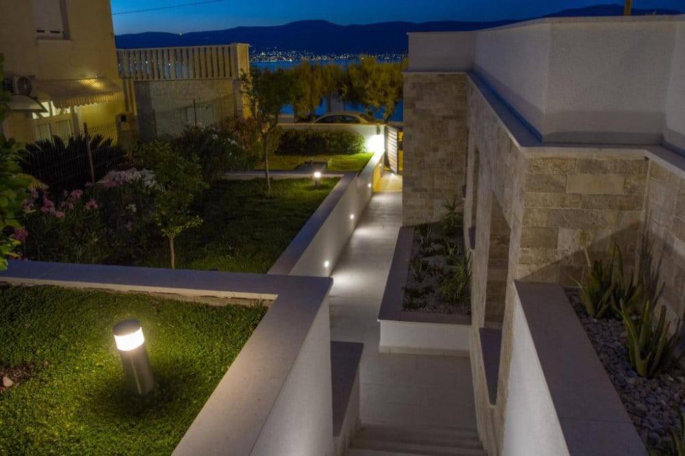 Ova prizemnica uz more od 97 m2 dovršena je 2018. godine, a sadrži tri spavaće sobe, dvije kupaonice, gostinjski toalet, potpuno opremljenu kuhinju (s mikrovalnom i pirolitičkom pećnicom) i dnevni boravak. Na zemljištu od 440m2 osim prizemnice nalazi se i veliki bazen, lijepo uređen vrt sa sustavom za navodnjavanje i s prostorom za odmor i blagovanje.Sve sobe su u potpunosti klimatizirane i imaju podno grijanje. Topla voda iz spremnika od 250L se proizvodi pomoću solarnog sustava.Najbliža plaža je odmah ispred vrata. U blizini vile nalaze se sadržaji kao što su restorani, trgovine i mala luka s putničkim trajektom za Split.Vila se iznajmljuje kao kuća za odmor od travnja do rujna i ostvaruje vrlo dobre prihode. Iz tog razloga kupnja se može izvršiti tek od rujna.Zračna luka Split udaljena je 11 km. Do Trogira ima 7 km, a do Splita