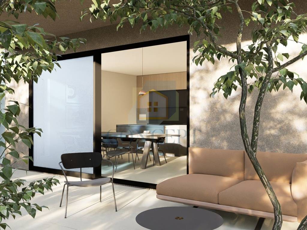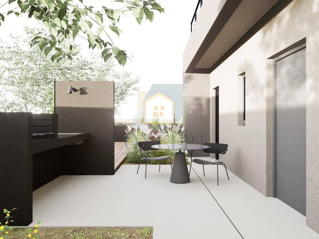 Okućnica obuhvaća ograđeni prostor s bazenom i sunčalištem, kao i uređeni vrt. S prednje strane kuće predviđen je parking za dva automobila.