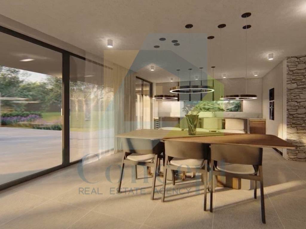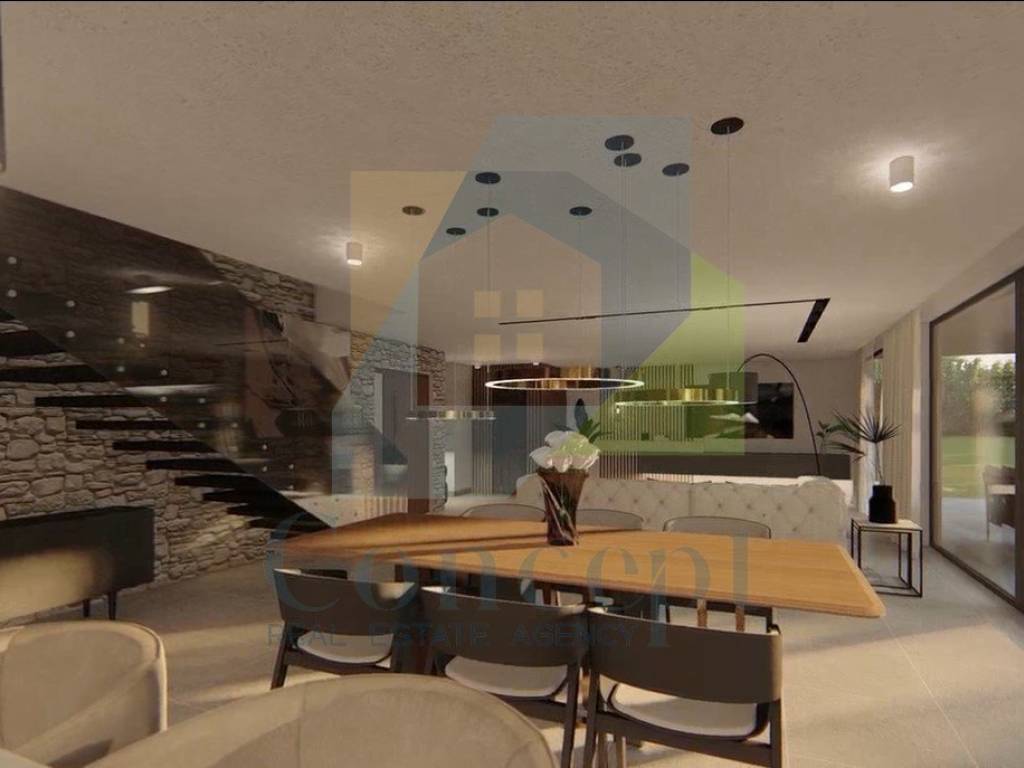 U prizemlju se nalazi ulazni hodnik koji vodi do prostranog dnevnog boravka, blagovaonice i kuhinje u otvorenom konceptu, povezanog staklenim stijenkama s vanjskom kuhinjom i natkrivenom terasom. Okućnica s bazenom i sunčalištem savršen je prostor za opuštanje i obiteljska druženja. Na ovoj etaži smješteni su i gostinjski toalet te tehnička soba.