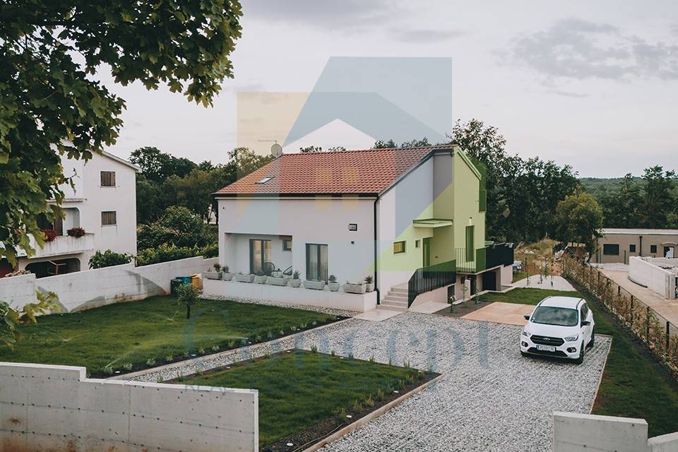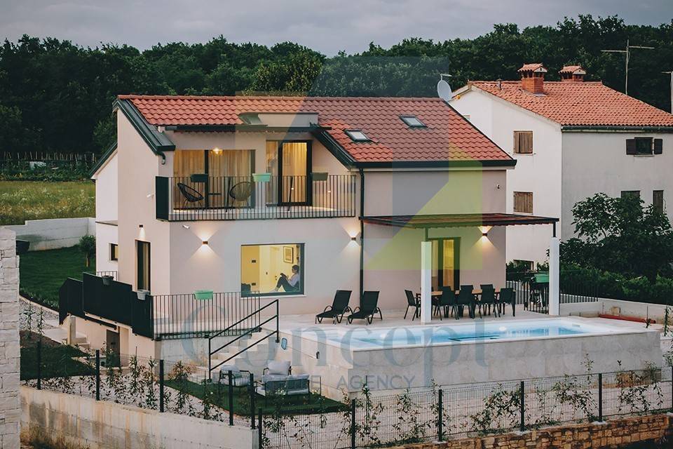Na mirnoj lokaciji, na rubu građevinske zone i samo 17 km od Poreča i mora, smještena je jedinstveno osmišljena kuća s bazenom.