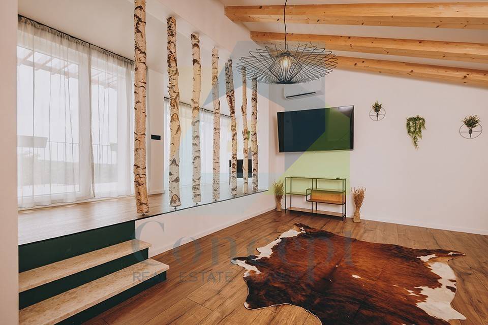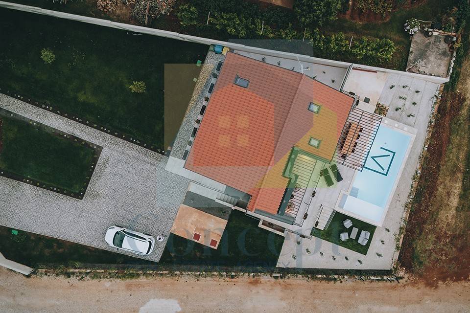 Kuća se prostire na suteren, prizemlje i prvi kat. U suterenu se nalaze teretana, prostor za igru, wellness soba, WC s tušem, tehnička prostorija za bazen te podrum za skladištenje. Prizemlje nudi prostran ulazni hodnik, kupaonicu i dvije spavaće sobe, od kojih jedna ima privatnu kupaonicu. Open space koncept dnevnog boravka, blagovaonice i kuhinje pruža otvoren pogled na bazen i izlaz na vanjsku terasu s pergolom, sunčalištem i bazenom veličine 9 m x 3,85 m.