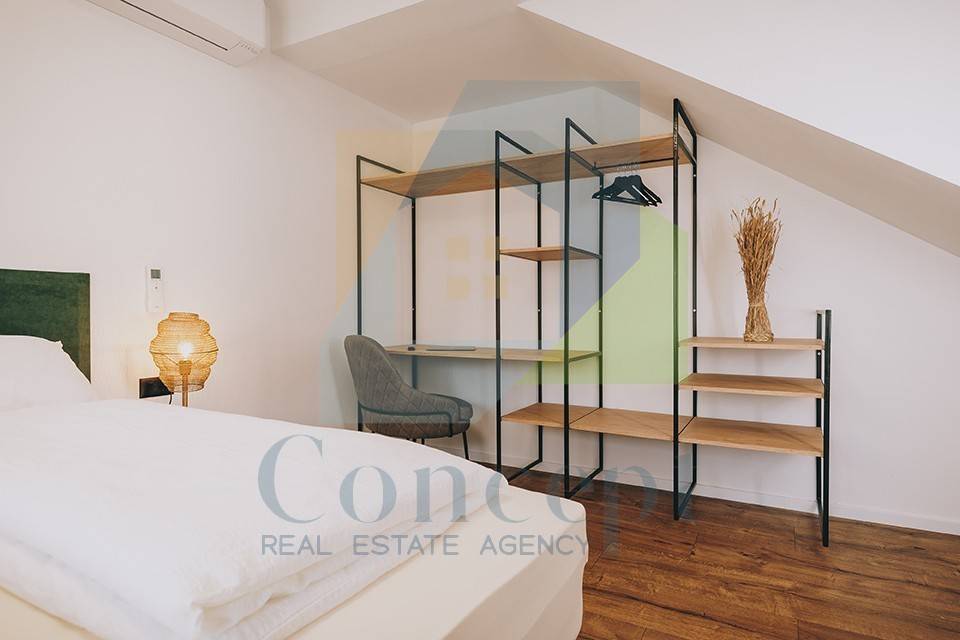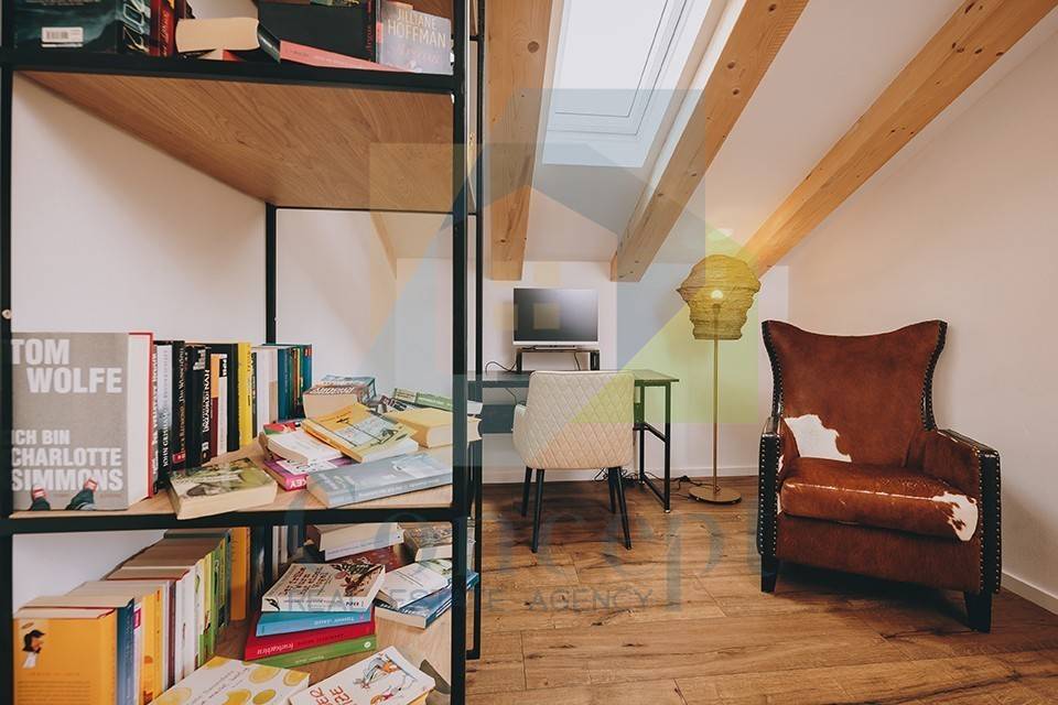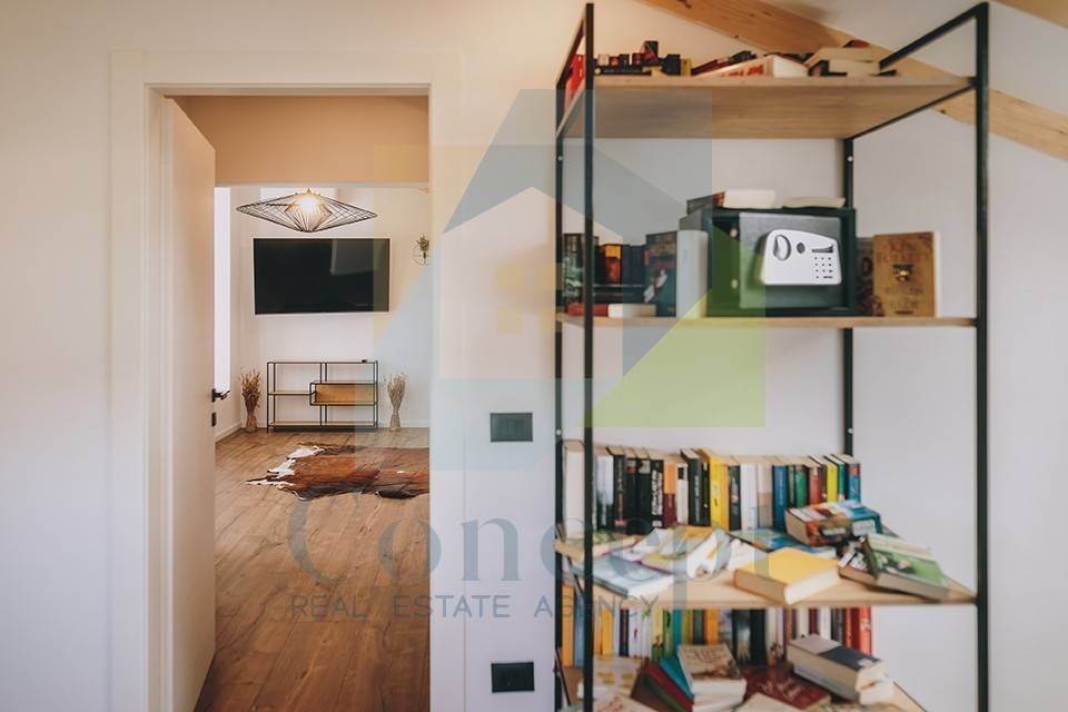 Na prvom katu smještena je radna soba ili biblioteka, kupaonica, tehnička soba i prostrana master spavaća soba s garderobom i balkonom, s kojeg se pruža prekrasan pogled na more i okolnu prirodu.