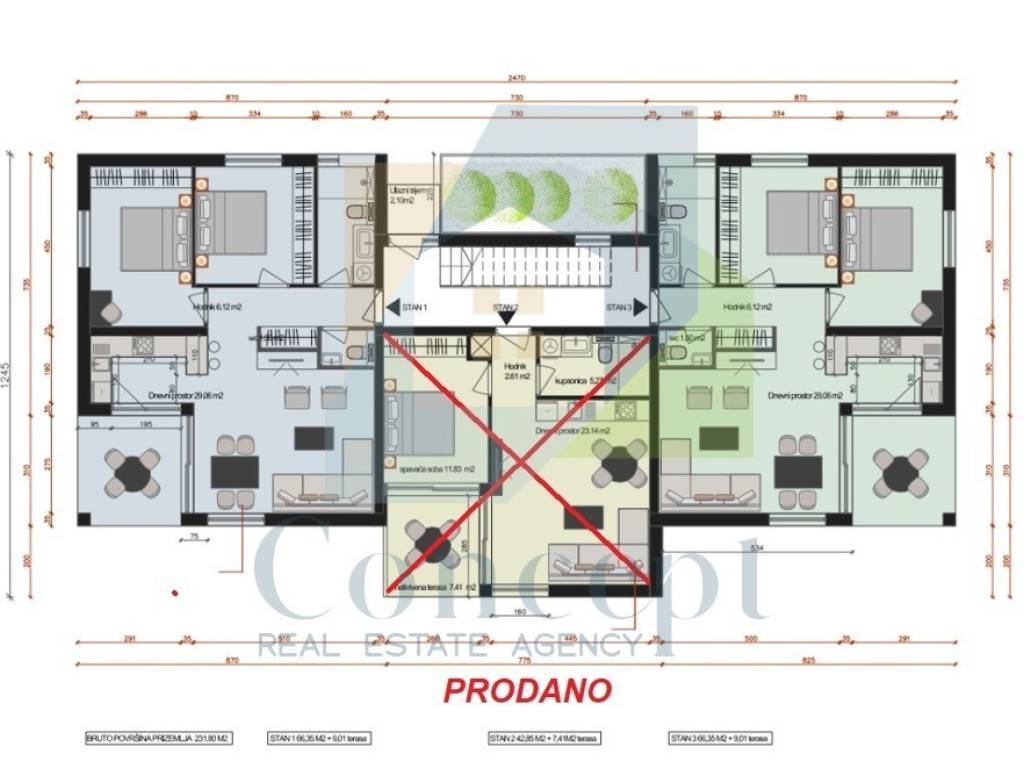 U prodaji je stan u prizemlju ukupne površine 68,03 m, kojem dodatno pripada terasa površine 8,99 m i prostrani vrt površine 120 m. Stan se sastoji od ulaznog hodnika, kupaonice, dvije spavaće sobe te dnevnog boravka s kuhinjom i blagovaonicom, iz kojeg se izlazi na natkrivenu terasu povezanu s vrtom.