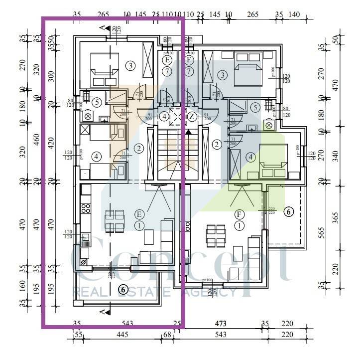 Stan površine 64,54 m sastoji se od ulaznog hodnika, dnevnog boravka s kuhinjom i blagovaonicom otvorenog koncepta, dvije spavaće sobe i kupaonice. Iz dnevnog boravka izlazi se na natkrivenu terasu od 7 m s pogledom na okolni krajolik i more.