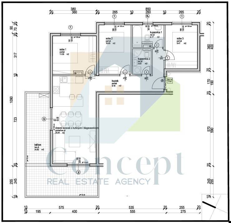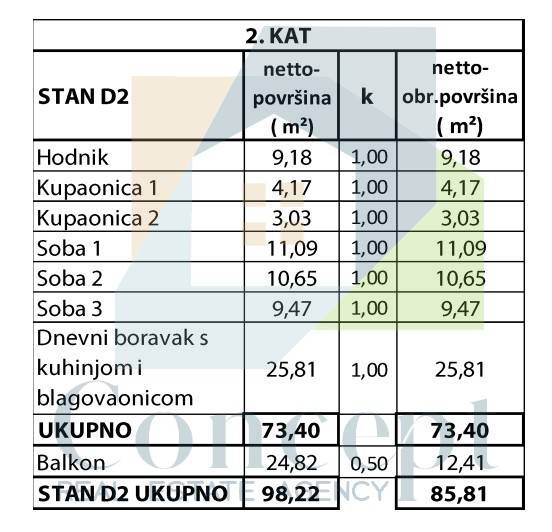 Stan ima površinu od 85,81 m i sastoji se od ulaznog hodnika, tri spavaće sobe, dvije kupaonice te prostranog dnevnog boravka s kuhinjom i blagovaonicom, iz kojih se izlazi na veliki balkon od gotovo 25 m.