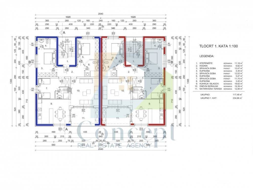 Stanovi na prvom katu sastoje se od ulaznog hodnika, tri spavaće sobe, od kojih svaka ima vlastitu kupaonicu, blagovaonice, kuhinje i dnevnog boravka s izlazom na balkon. Planirano je da stanovi imaju velike staklene stijene koje će propuštati obilje prirodne svjetlosti i pružati ugodan pogled.