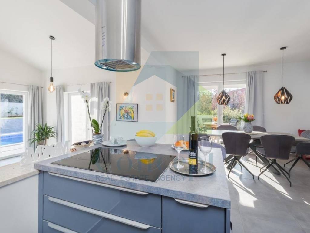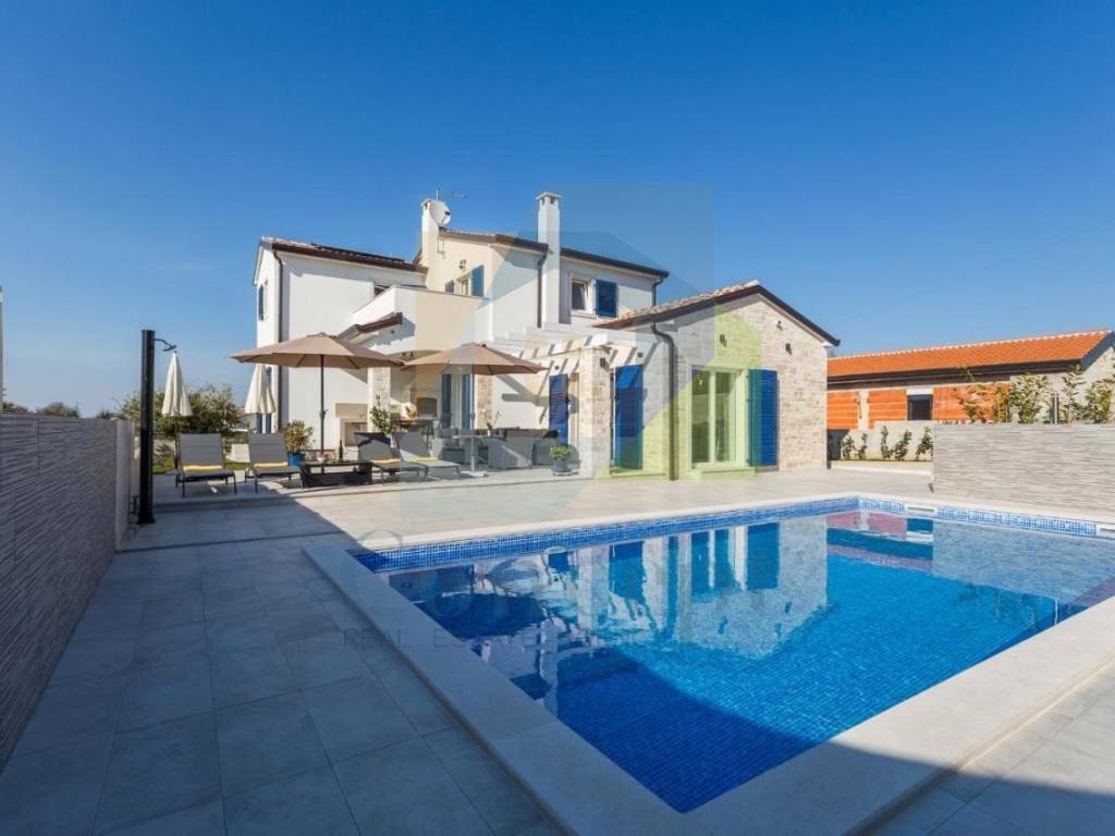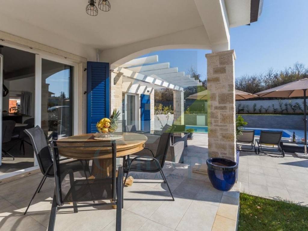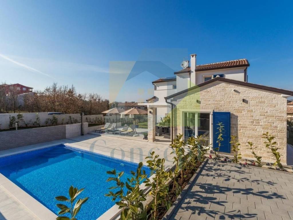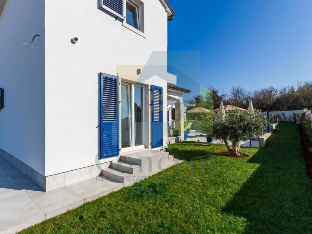U lijepo uređenoj okućnici nalazi se bazen površine 32 m, sunčalište, vanjska kuhinja, vrtna kućica te tri parkirna mjesta s električnim vratima i portafonom. Okućnica je opremljena automatskim navodnjavanjem i video nadzorom.