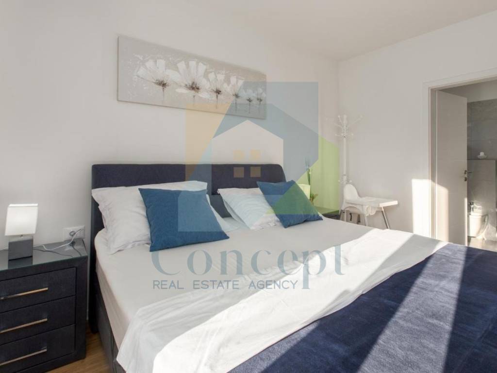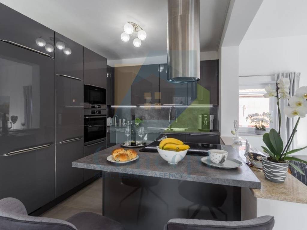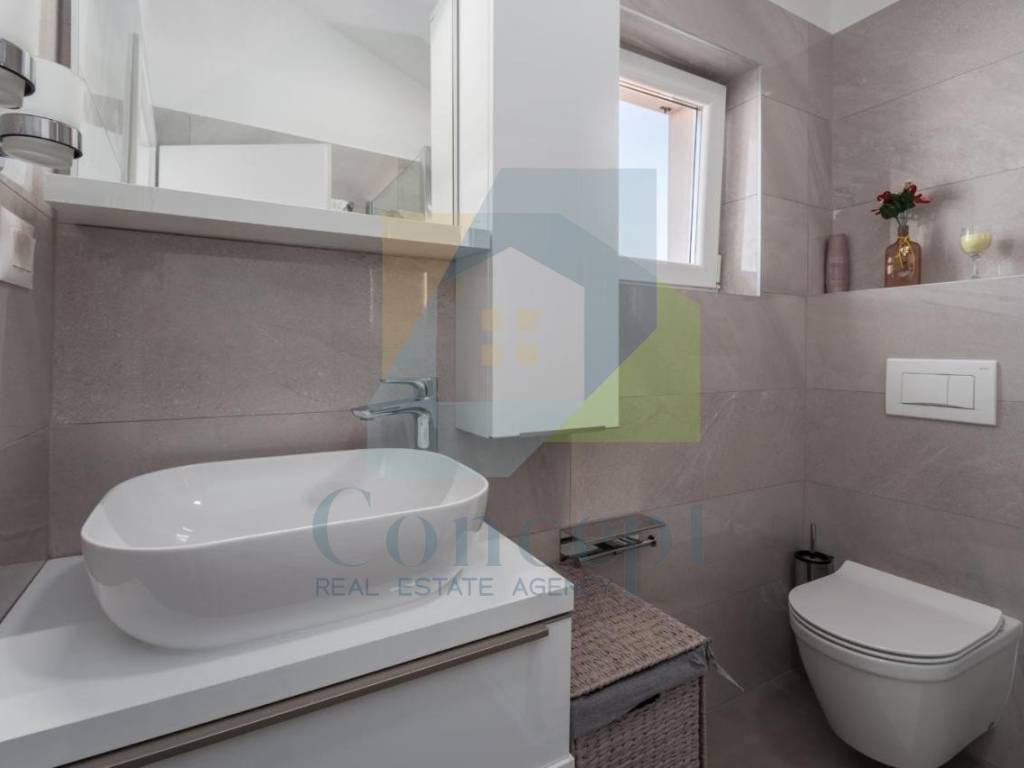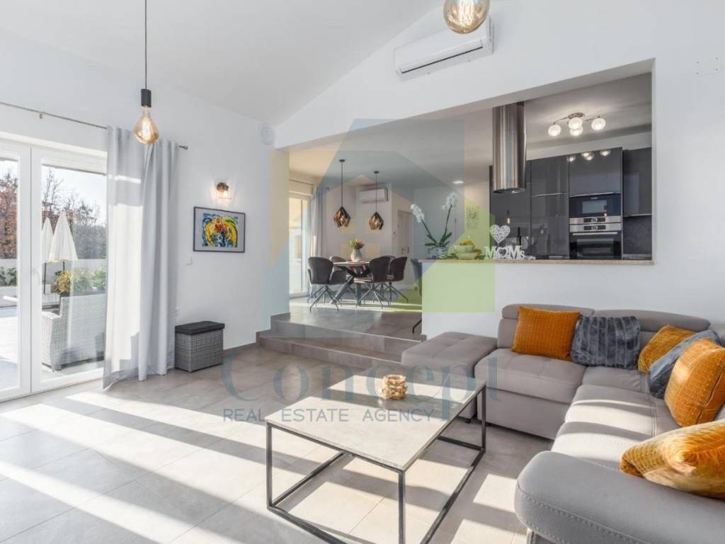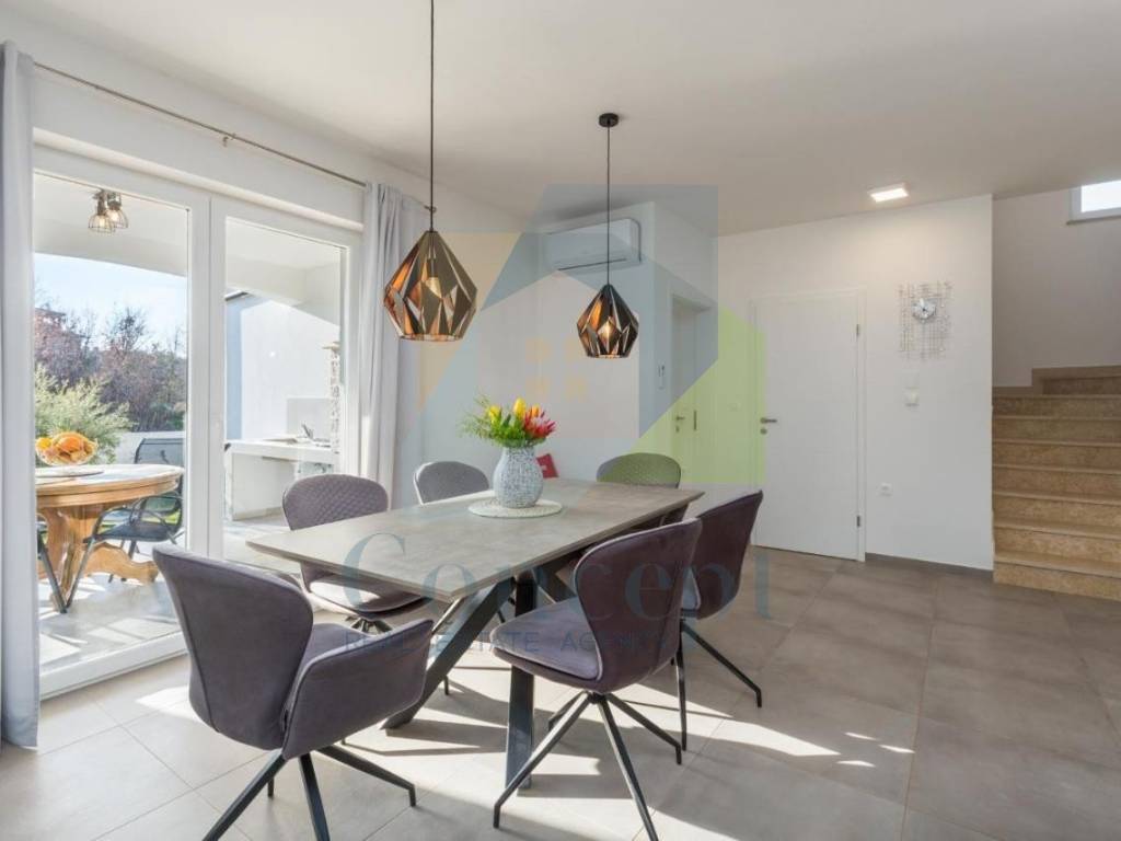 U lijepo uređenoj okućnici nalazi se bazen površine 32 m, sunčalište, vanjska kuhinja, vrtna kućica te tri parkirna mjesta s električnim vratima i portafonom. Okućnica je opremljena automatskim navodnjavanjem i video nadzorom.