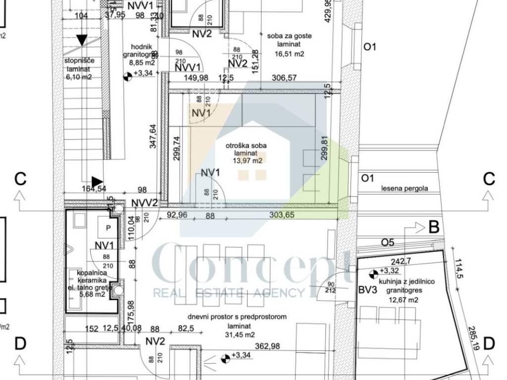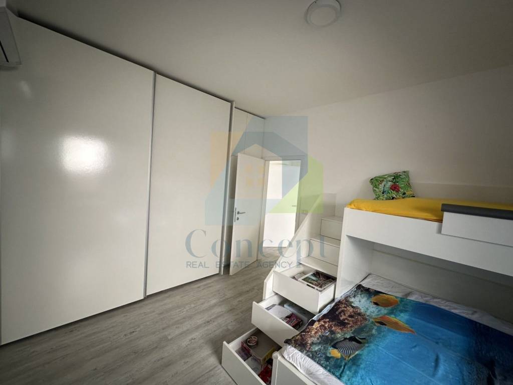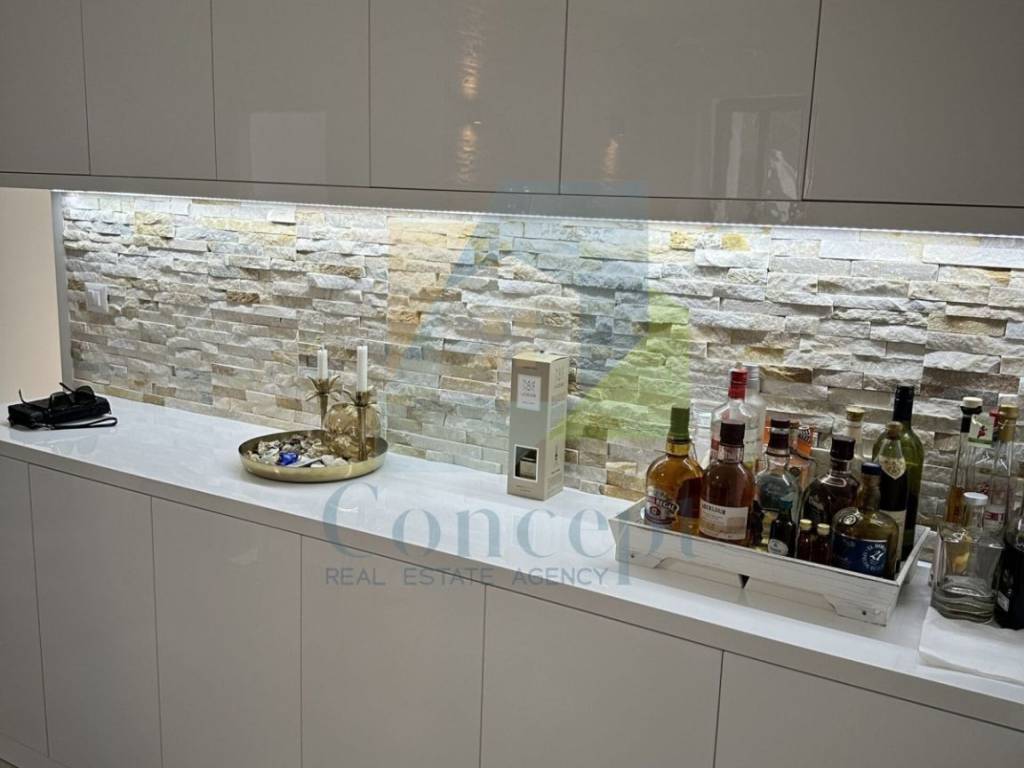 Sastoji se od prostranog dnevnog boravka s blagovaonicom, odvojene kuhinje, tri spavaće sobe od kojih je jedna opremljena kao dječja soba, a druga ima vlastitu kupaonicu te još jedne dodatne kupaonice. Grijanje je podno u kuhinji i kupaonicama, a svaka prostorija opremljena je klima uređajem. Svi prozori imaju ugrađene komarnike.