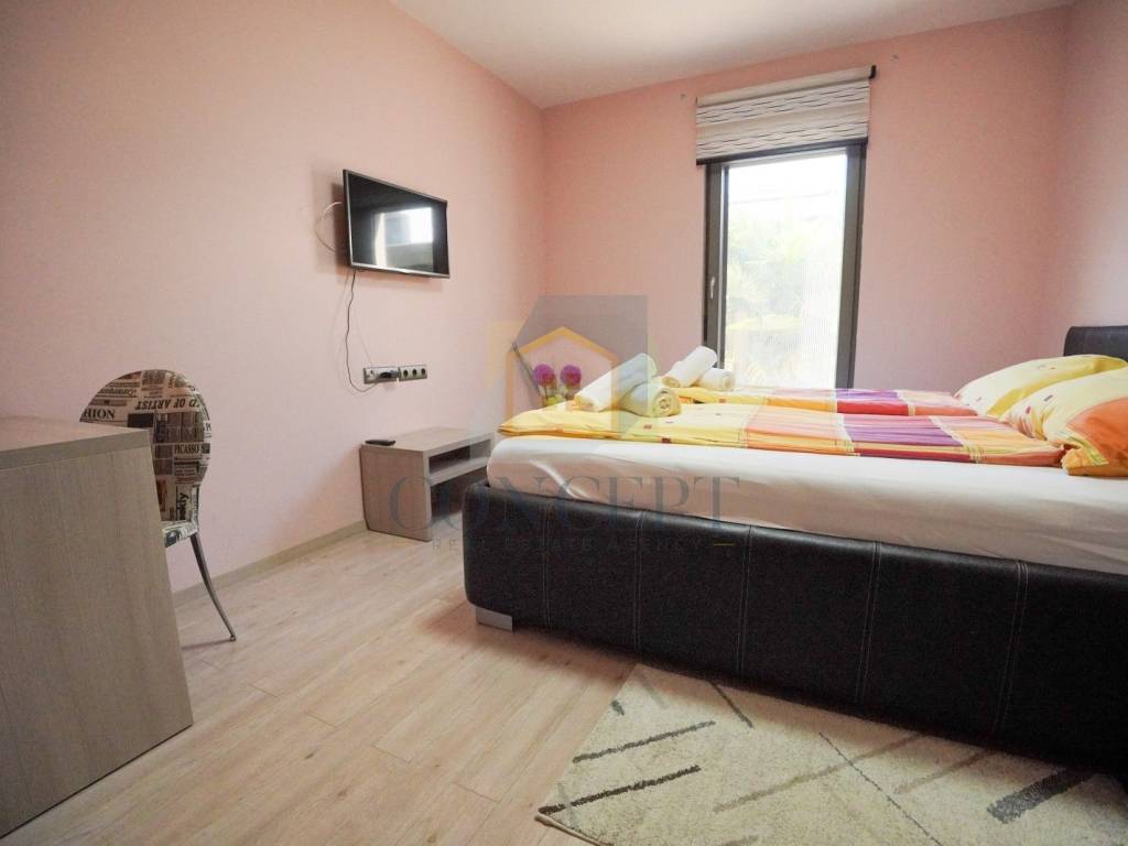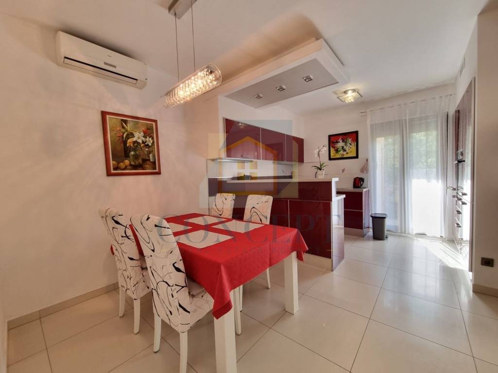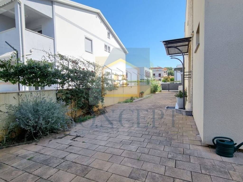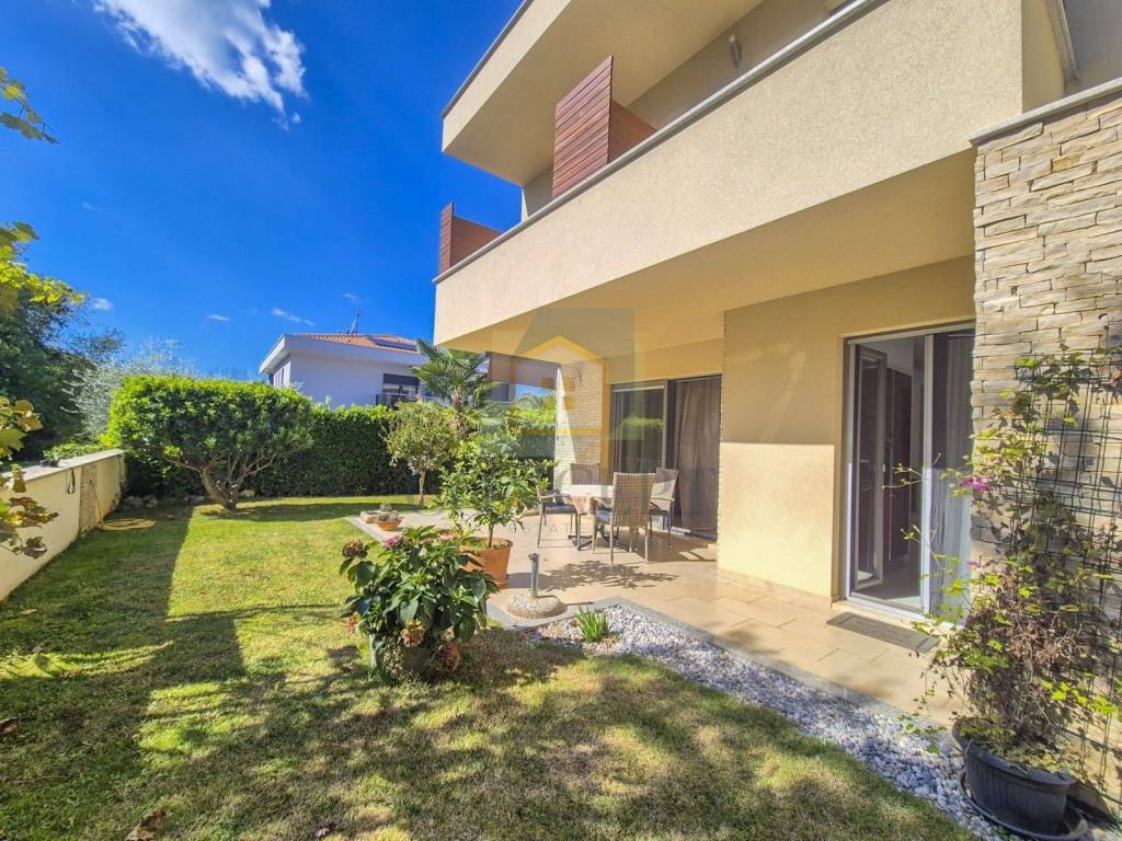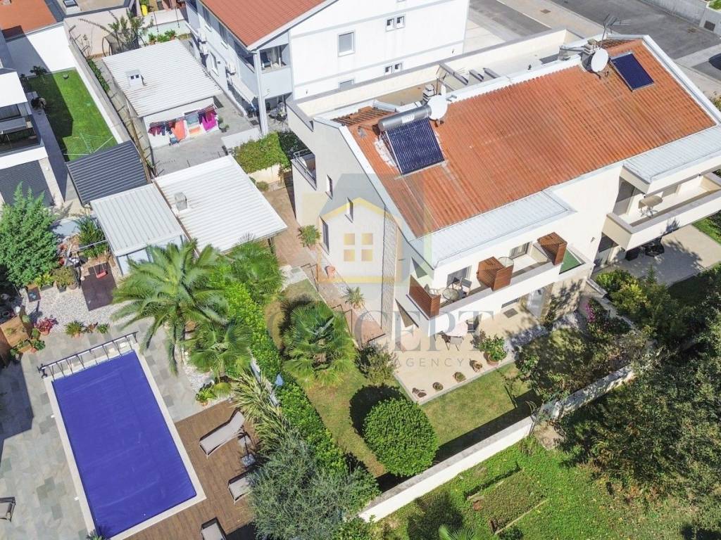 Ukupna stambena površina iznosi 143 m, raspoređena na prizemlje i kat. U prizemlju se nalazi stan koji se sastoji od hodnika, ostave, jedne spavaće sobe s kupaonicom, kuhinje i blagovaonice, dnevnog boravka s kaminom te izlaza na terasu i uređeno dvorište površine 184 m. U dvorištu se nalazi ljetna kuhinja opremljena grilom, krušnom peći, priključcima za vodu i struju te dodatna ostava.