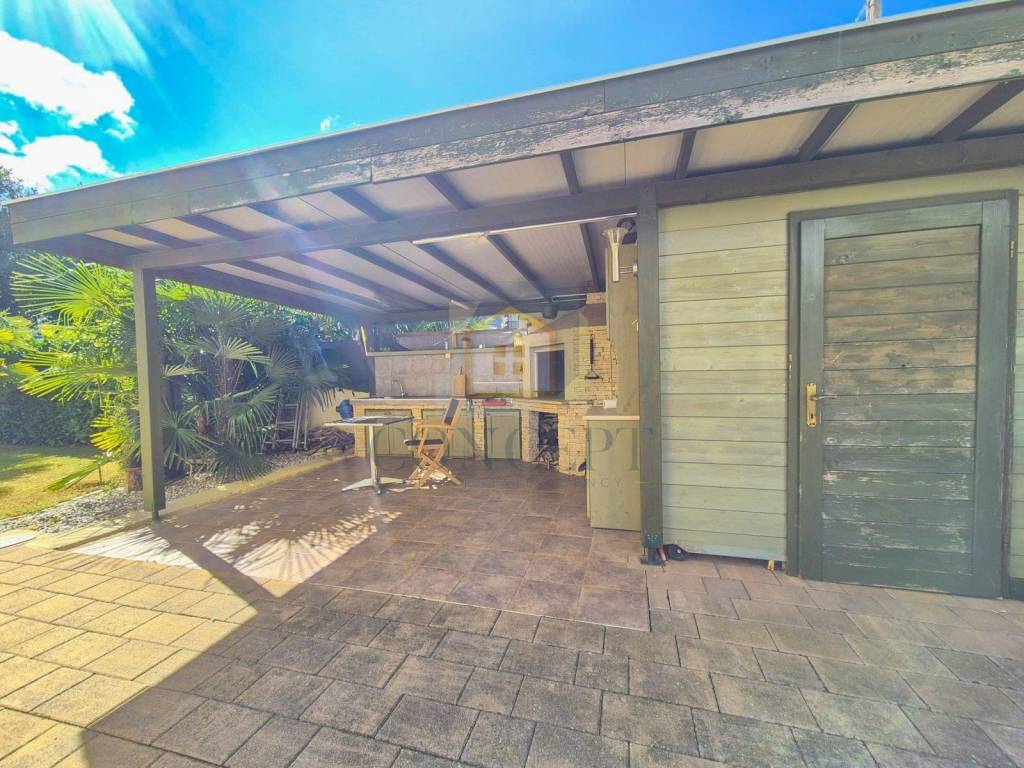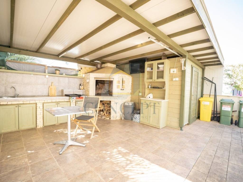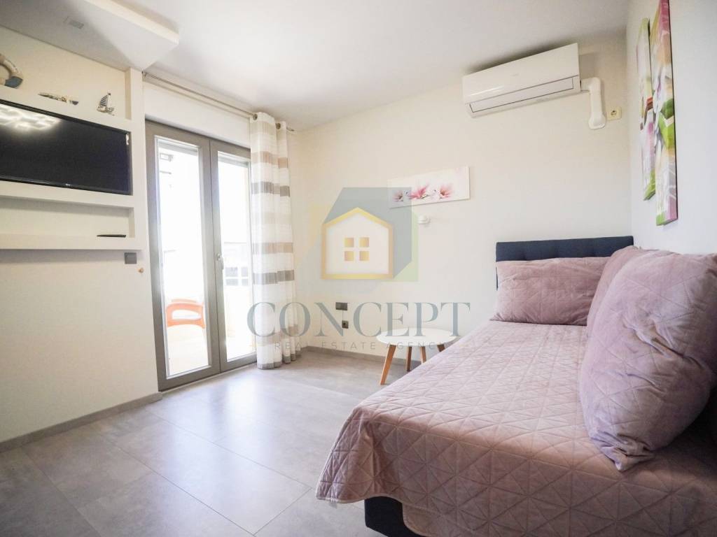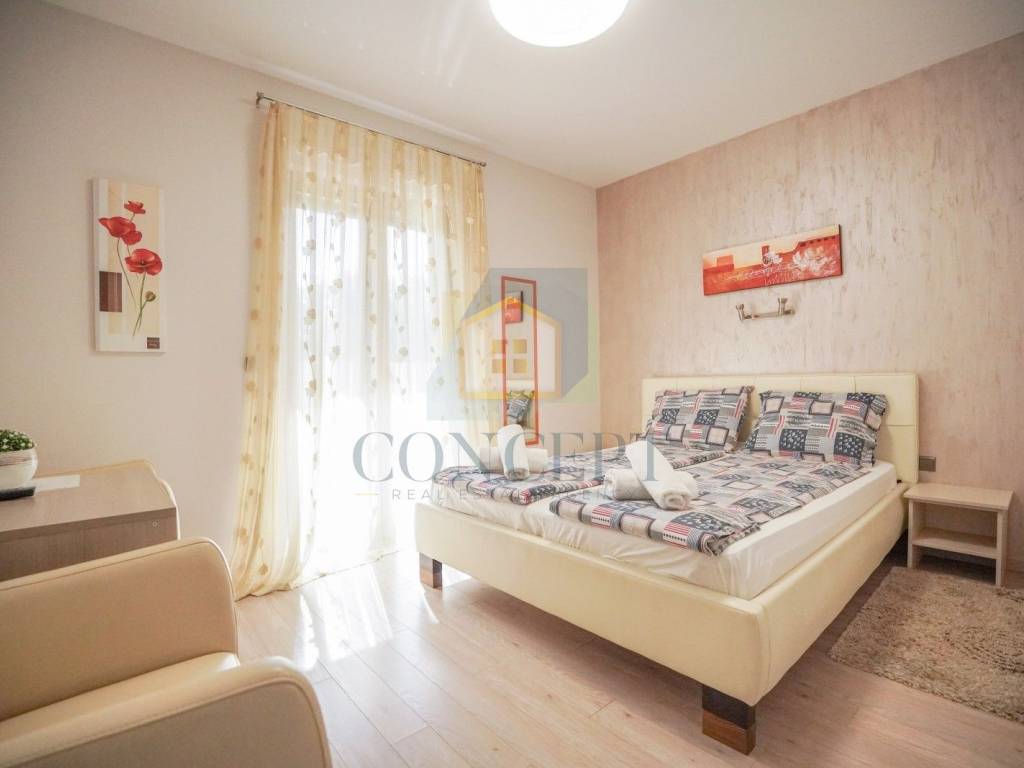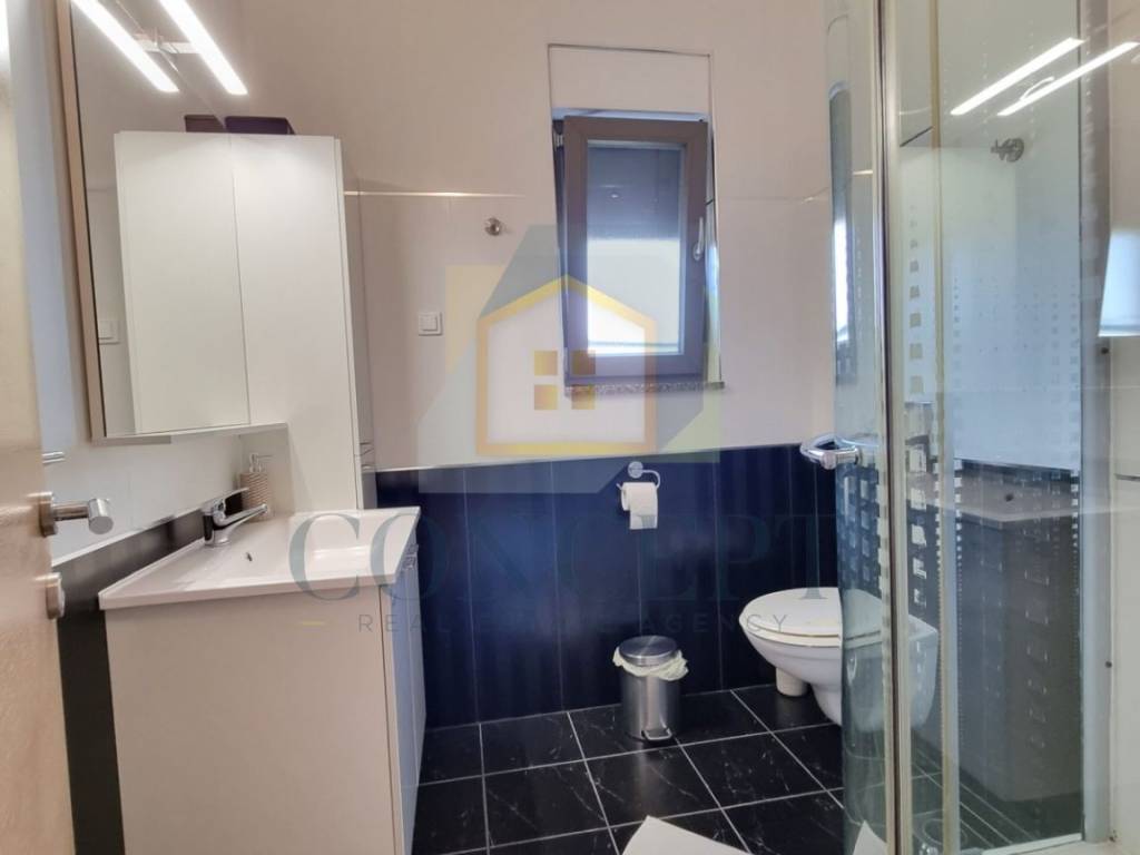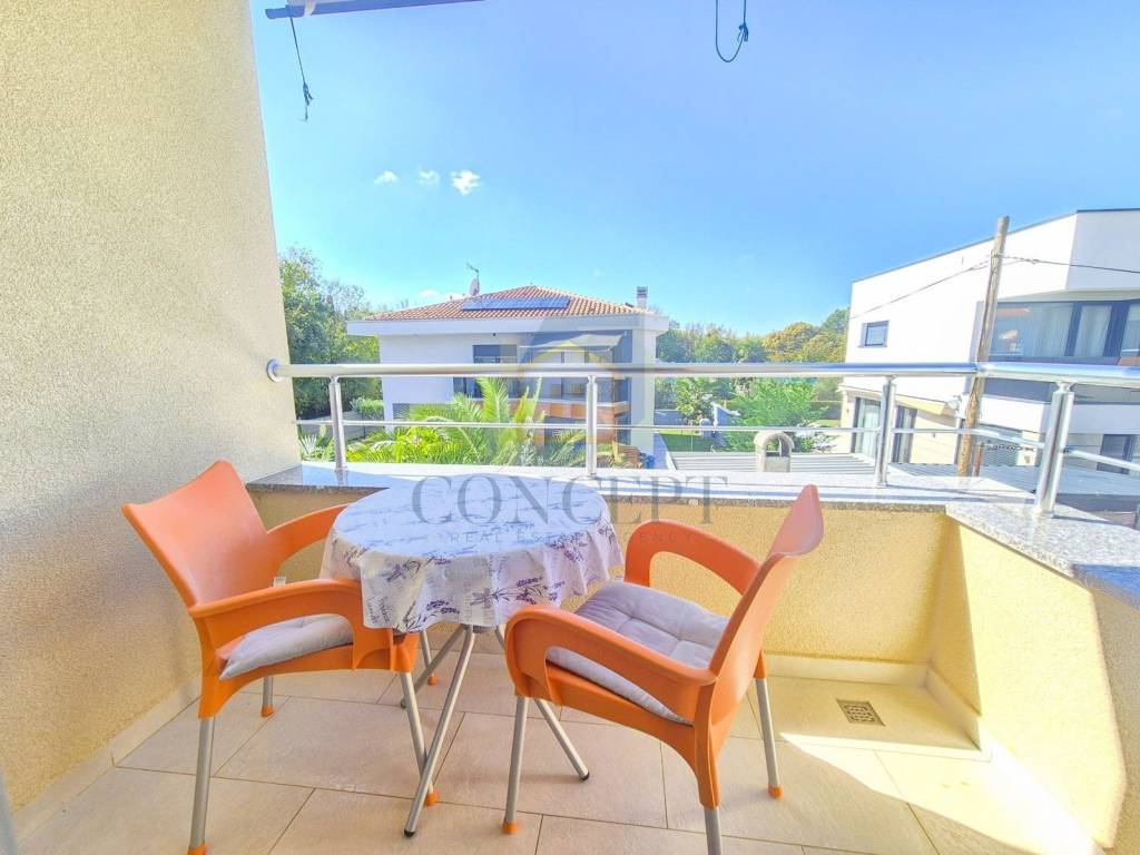 Ukupna stambena površina iznosi 143 m, raspoređena na prizemlje i kat. U prizemlju se nalazi stan koji se sastoji od hodnika, ostave, jedne spavaće sobe s kupaonicom, kuhinje i blagovaonice, dnevnog boravka s kaminom te izlaza na terasu i uređeno dvorište površine 184 m. U dvorištu se nalazi ljetna kuhinja opremljena grilom, krušnom peći, priključcima za vodu i struju te dodatna ostava.