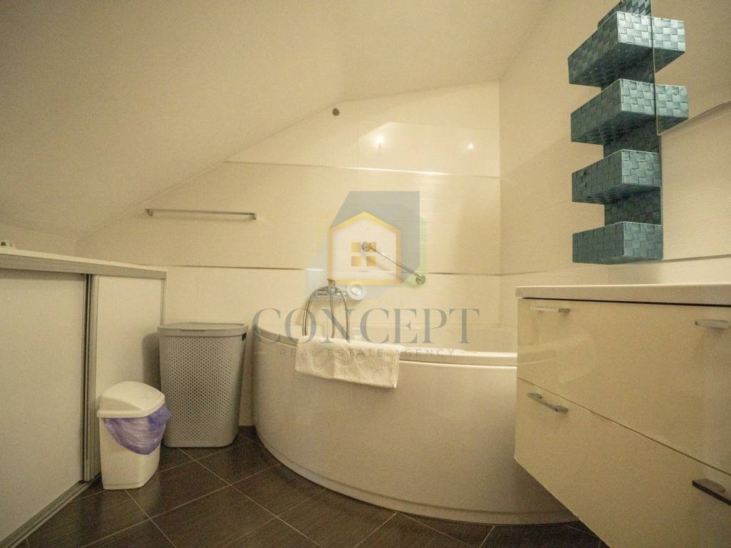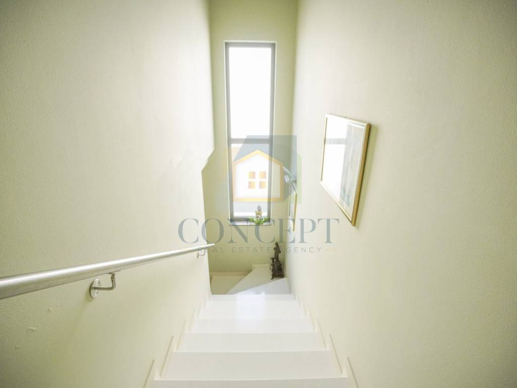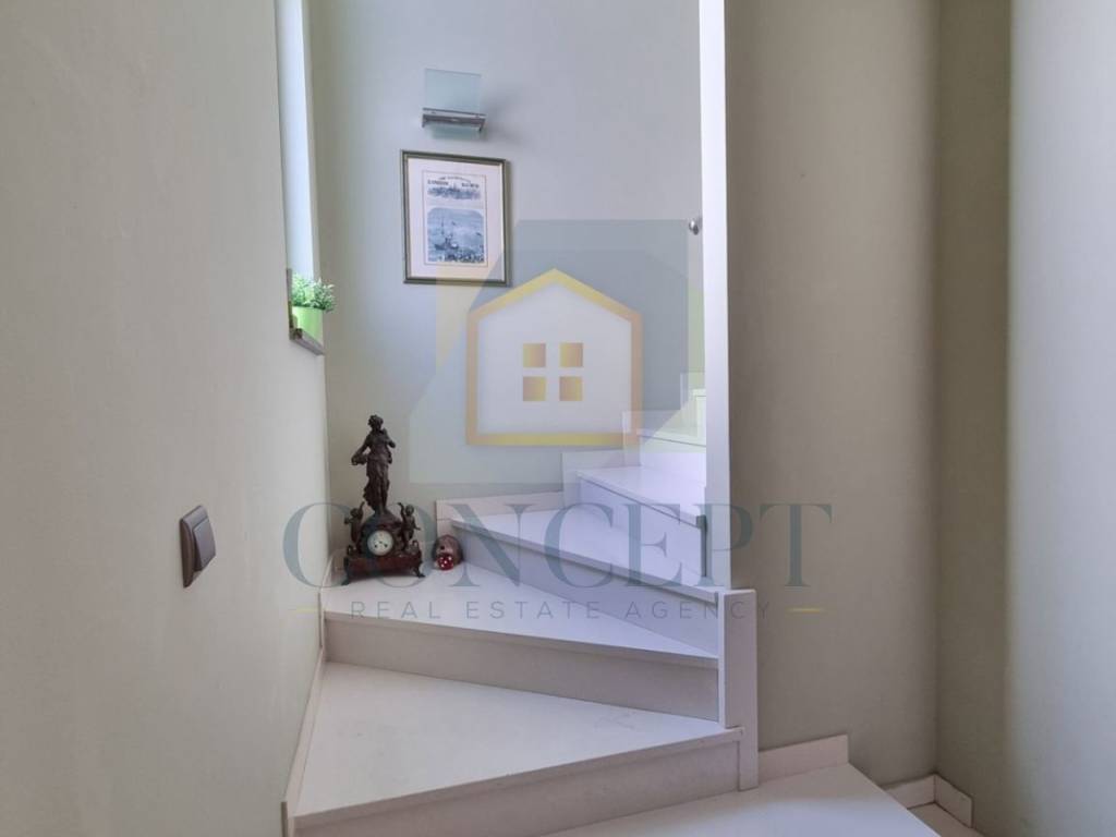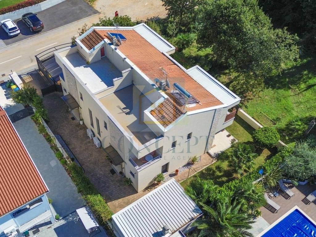 Na katu se nalazi drugi stan s dvije spavaće sobe, svaka s vlastitom terasom i pogledom na prirodu, tri kupaonice te dnevnim boravkom, kuhinjom i blagovaonicom s izlazom na natkrivenu terasu.