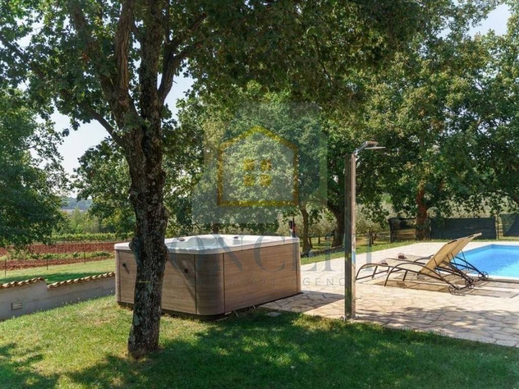U dvorištu se nalaze bazen površine 24 m, vanjski tuš, whirlpool, sunčalište i roštilj. Na raspolaganju su tri parkirna mjesta.